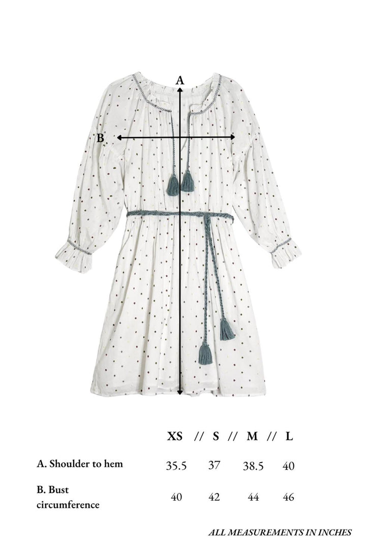 The Isla Dress just makes us happy. New for spring, the flowy silhouette with dramatic full sleeves can be worn loose or belted at the waist with the optional tassel sash, which comes in a muted blue to match our custom Confetti Dot fabric that's embroidered with tiny flecks of soft color—pink, green, blue, and yellow. The neck is elastic, which is a bonus for quick changes and nursing moms.
