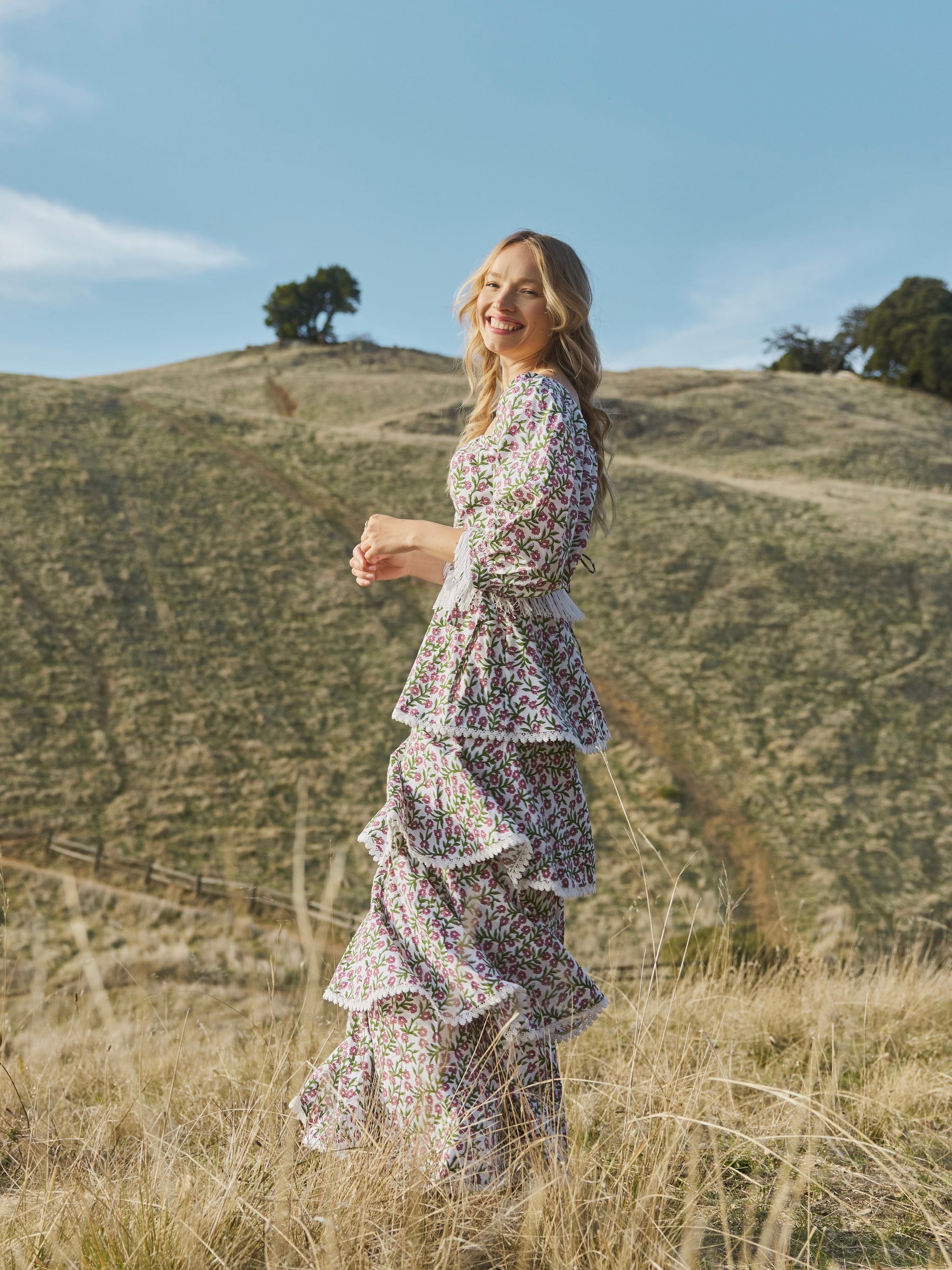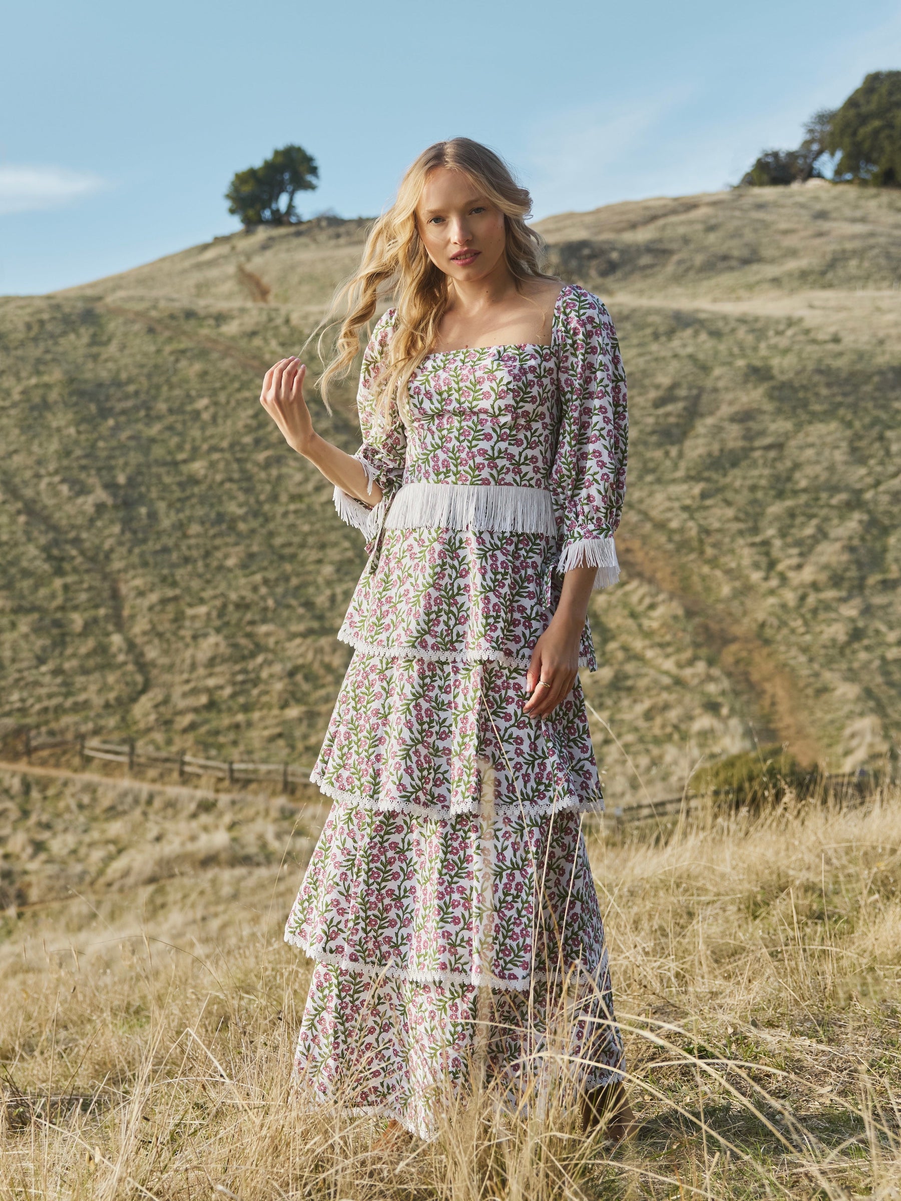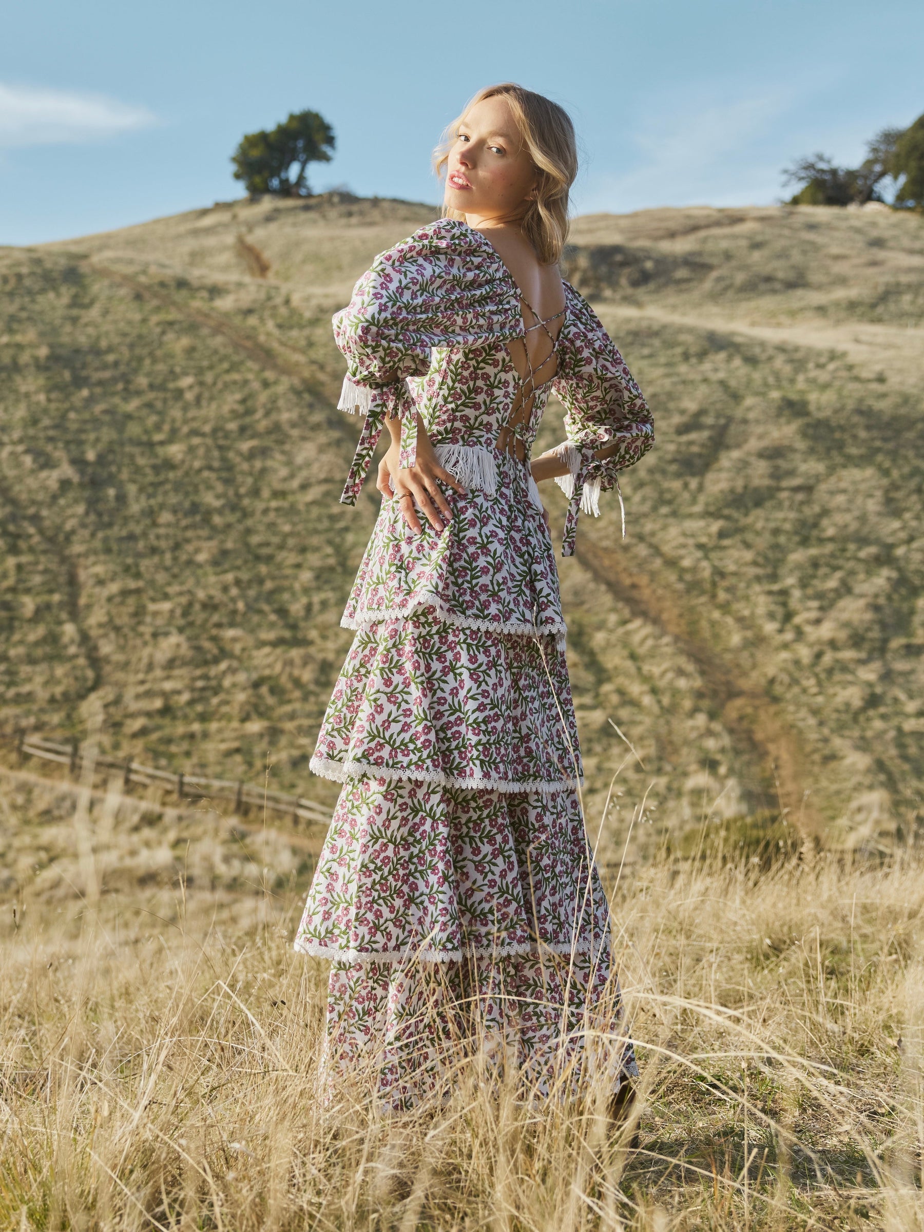 The Peyton is an exquisite top full of fringy fun. This slightly cropped silhouette has dramatic puff sleeves made from lightweight cotton that contrast beautifully with the more fitted bodice. Peyton features a lace-up back as an added detail