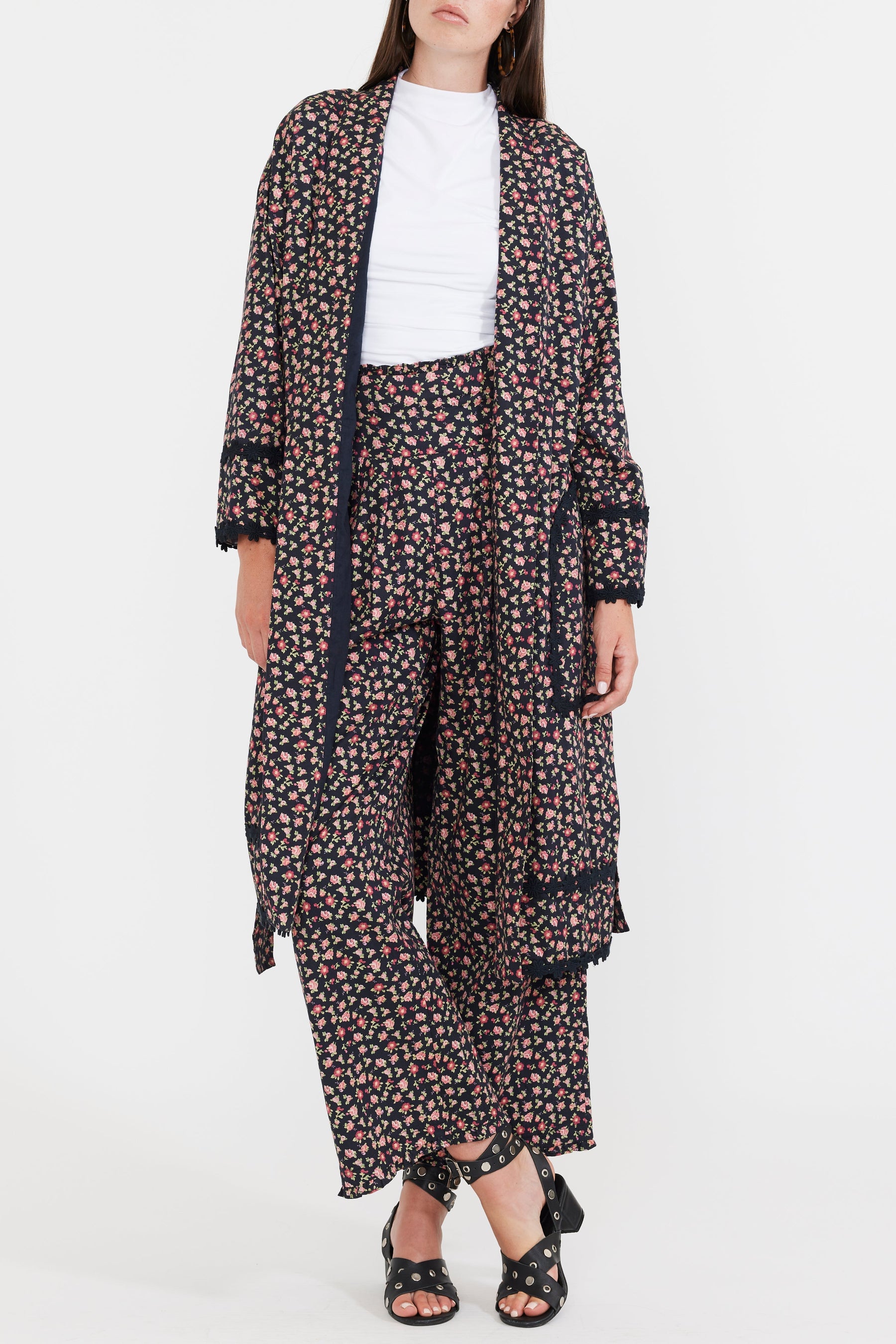 Crafted with cotton, this robe jacket is the best of both worlds. Breathable, long sleeve, side pockets, remove able waist belt, and midi length. Perfect for season transitions and easy wear. Detailed with black crochet lace.