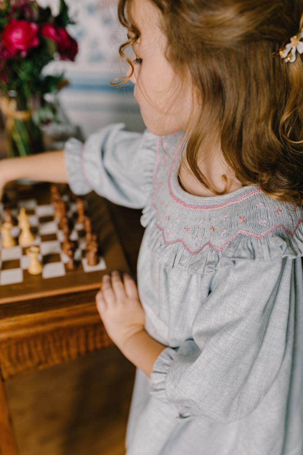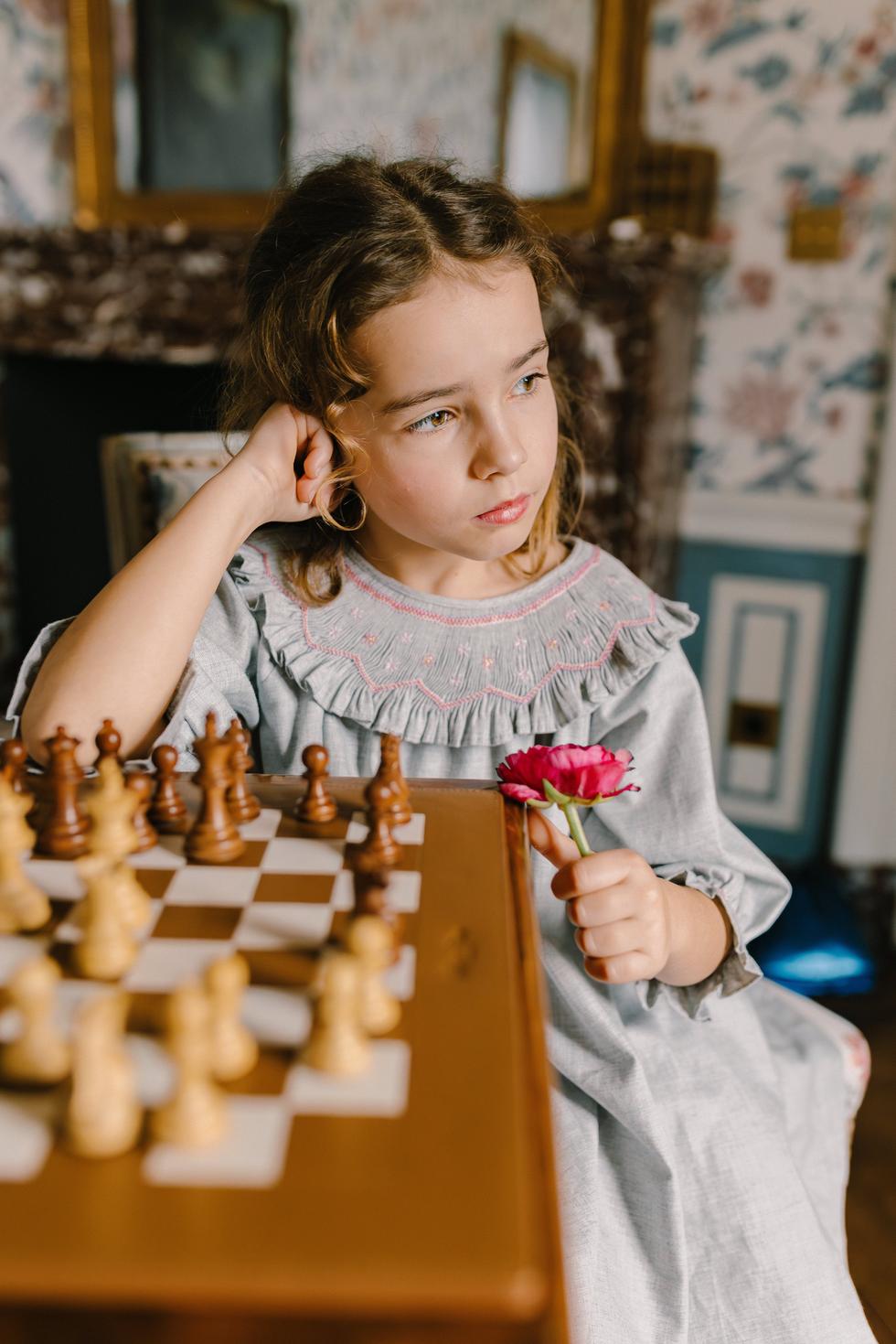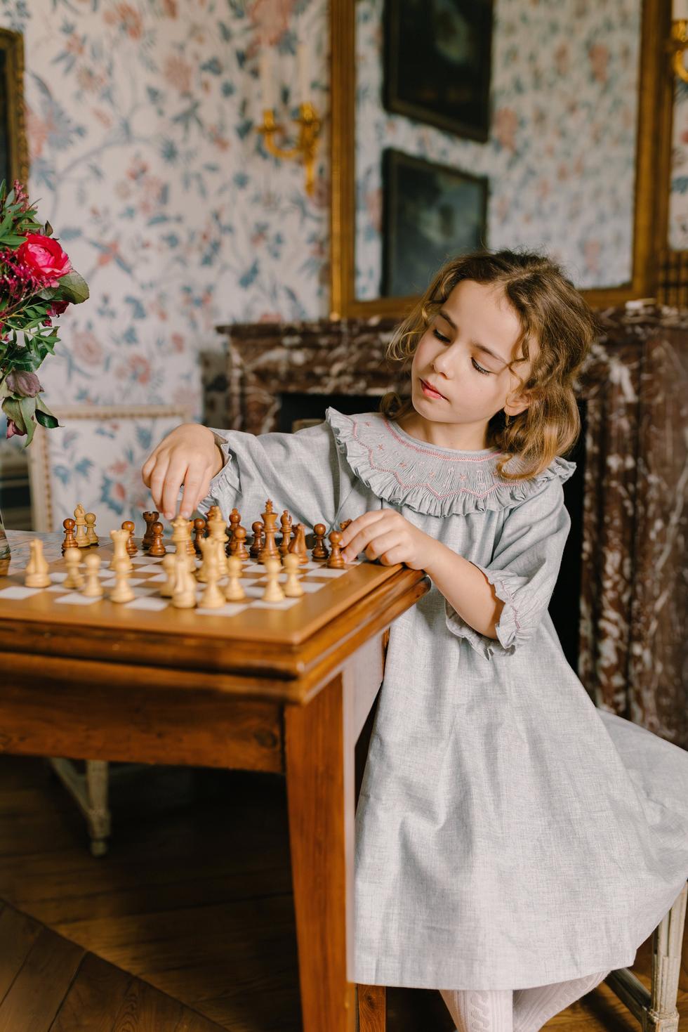 - French elegant handmade 3/4 bishop grey flannel dress with a ruffled smocked collar.