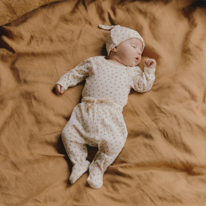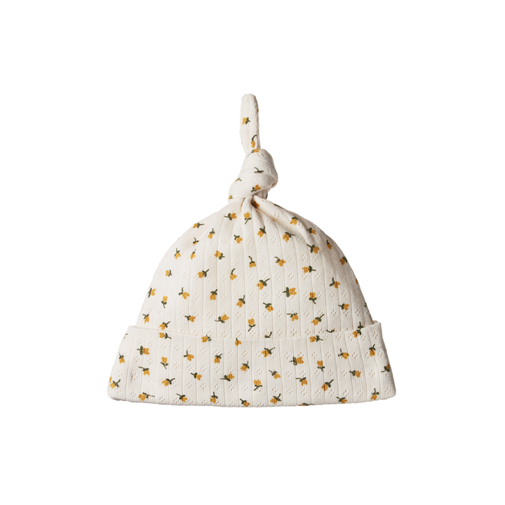 Keep baby covered top to toe with our organic cotton accessories. The knotted beanie is adjustable to ensure the perfect fit, and is an essential to prevent heat loss. Made in our beautiful pointelle fabric which is super soft and stretchy, perfect for the first few weeks and months of life. To minimise shrinkage, this fabric has been pre-washed. *GOTS certified CU 862149 *100% organic cotton pointelle *adjustable knotted top *folded hem detail