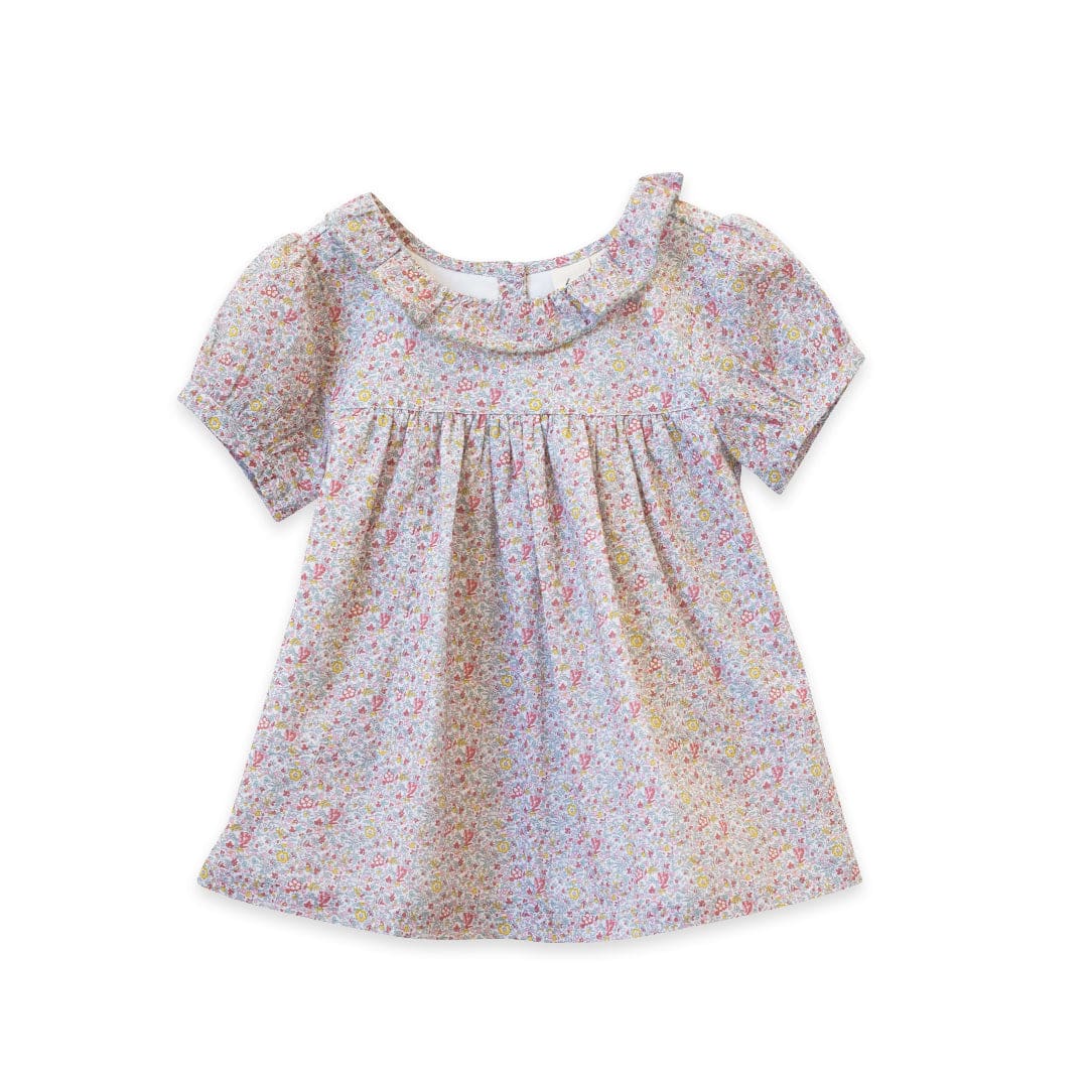 A charming little dress to match their cheery smiles and infectious giggles. The Emily features a ruffle around the neck line with picoting lace in a deeper color for a beautiful look. Sleeves add a little puff and volume. The dress has a gentle drape that looks cute with bloomers, skirts, leggings or any choice of favorite bottoms. Ages: 6 months to 2 years. Colors: Yellow buttercup, Red floral.