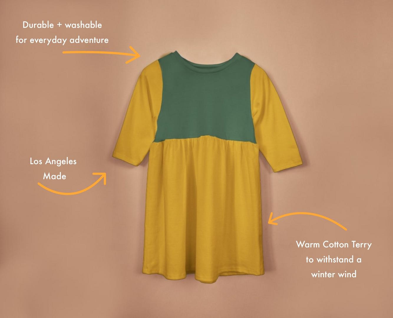 For when your little one insists on wearing a dress even when it's chilly. Made of durable, cozy organic cotton that's warm enough to sleep in. Thicker and more structured than our jersey dresses, the Terry Dress will grow with your little through every season, and withstand hundreds of washes. For all day wear (and also night, if they want).
