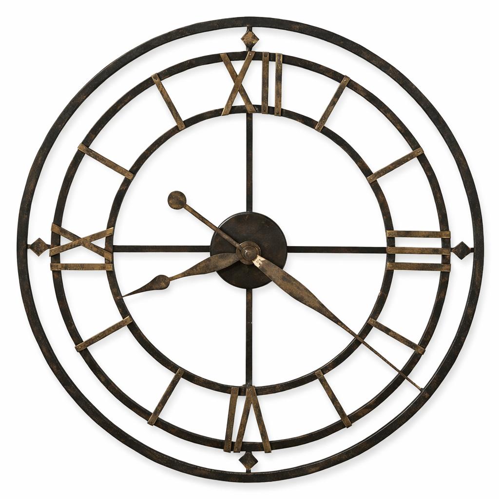This antique style wrought iron wall clock is finished in aged iron with antique gold finished outer ring. Antique gold finished diamond shapes and Roman numerals mark the 12, 3, 6, and 9 hours. Antique gold hour and minute hands. Quartz, battery-operated movement. Diameter 21-1/4" Depth 1-3/4".