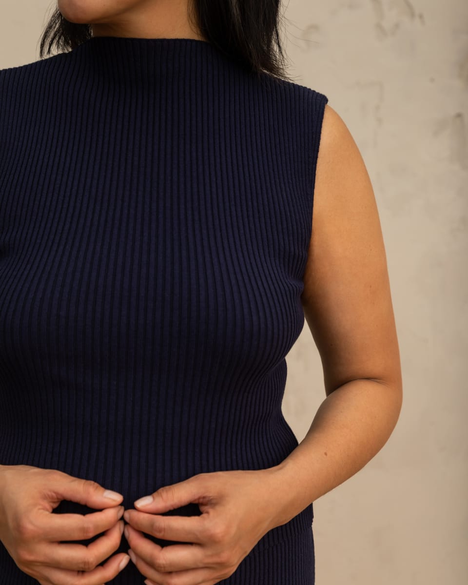 Tank 01 is a sleek, reversible tank that you'll be wearing on repeat. Elegant and minimal, it was knit with 90% GOTS organic cotton using our zero-waste method, technical knitting. Worn as a mockneck or with a plunging neckline, this multiway tank top with a ribbed knit detail comfortably elevates everyday looks with ease. Made with 90% GOTS-certified Organic Cotton, 10% Elastane.