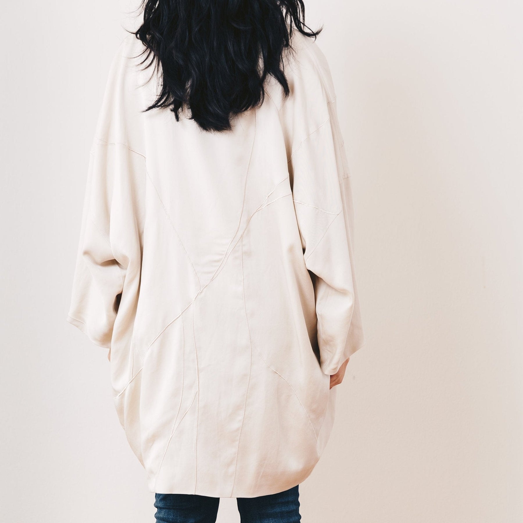 Our oversized Yuki jacket in silky Tencel Twill is the perfect layering piece. Inspired by the Japanese art of kintsugi, the embroidery adds a subtle textural element to a sleek design.