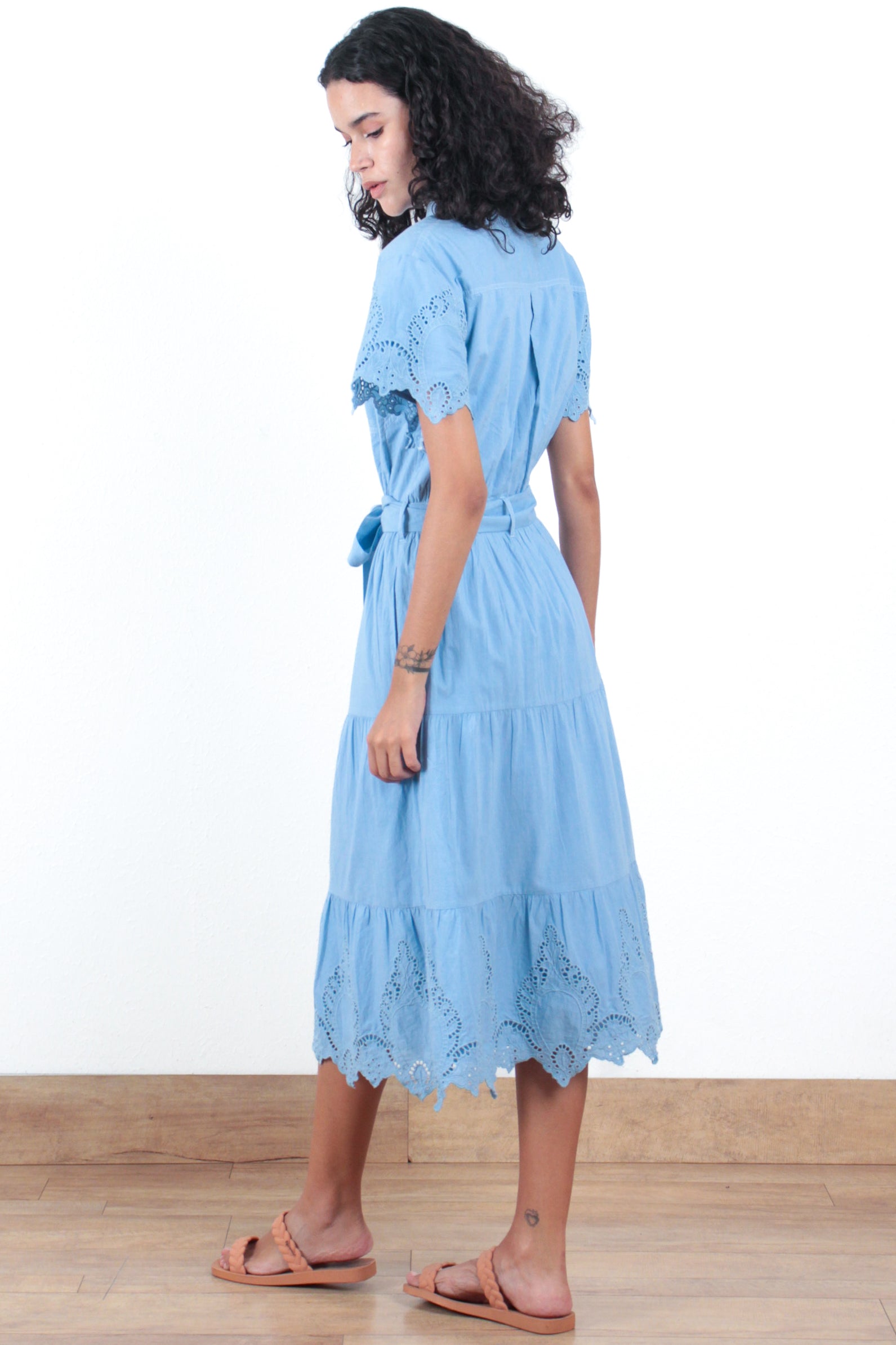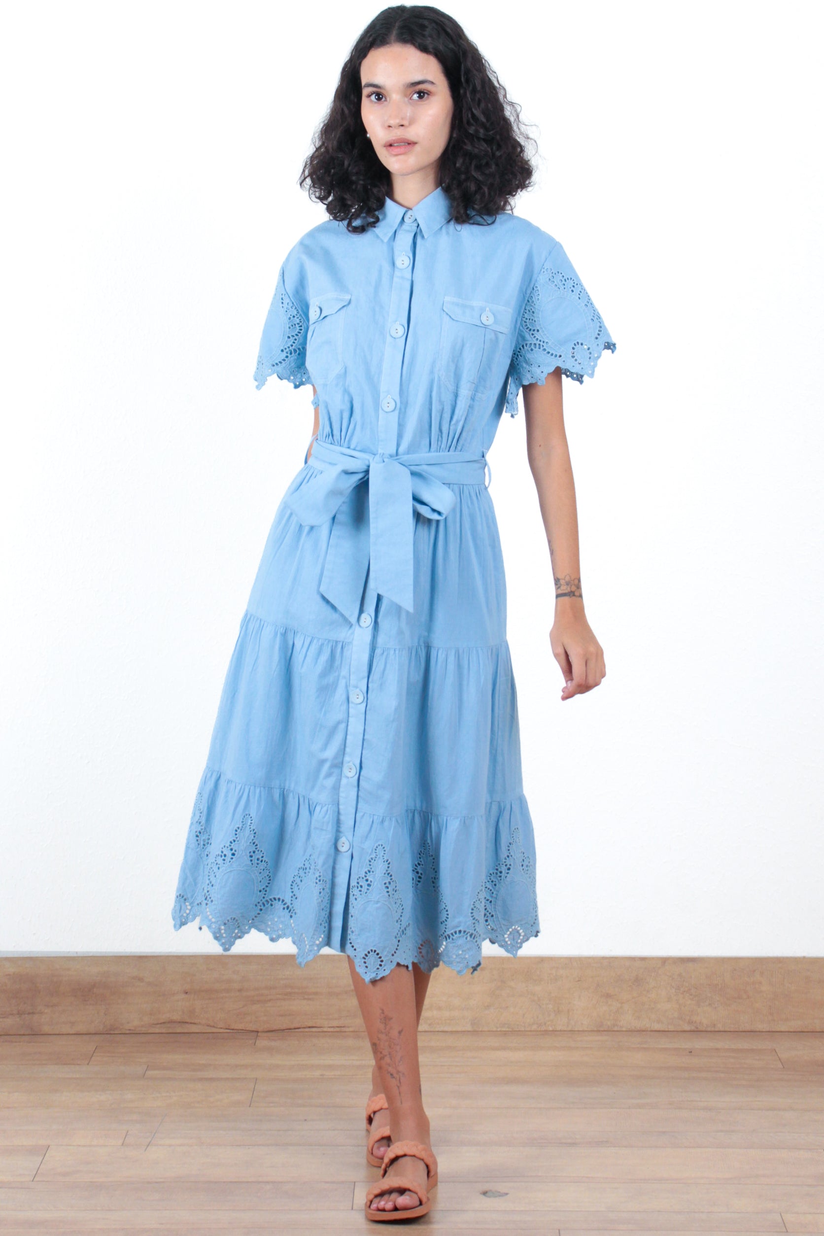 Cotton shifley midi dress with button front, collar detail and cutwork embroidery detail at hem of sleeves and body. Style has fabric belt at waist.