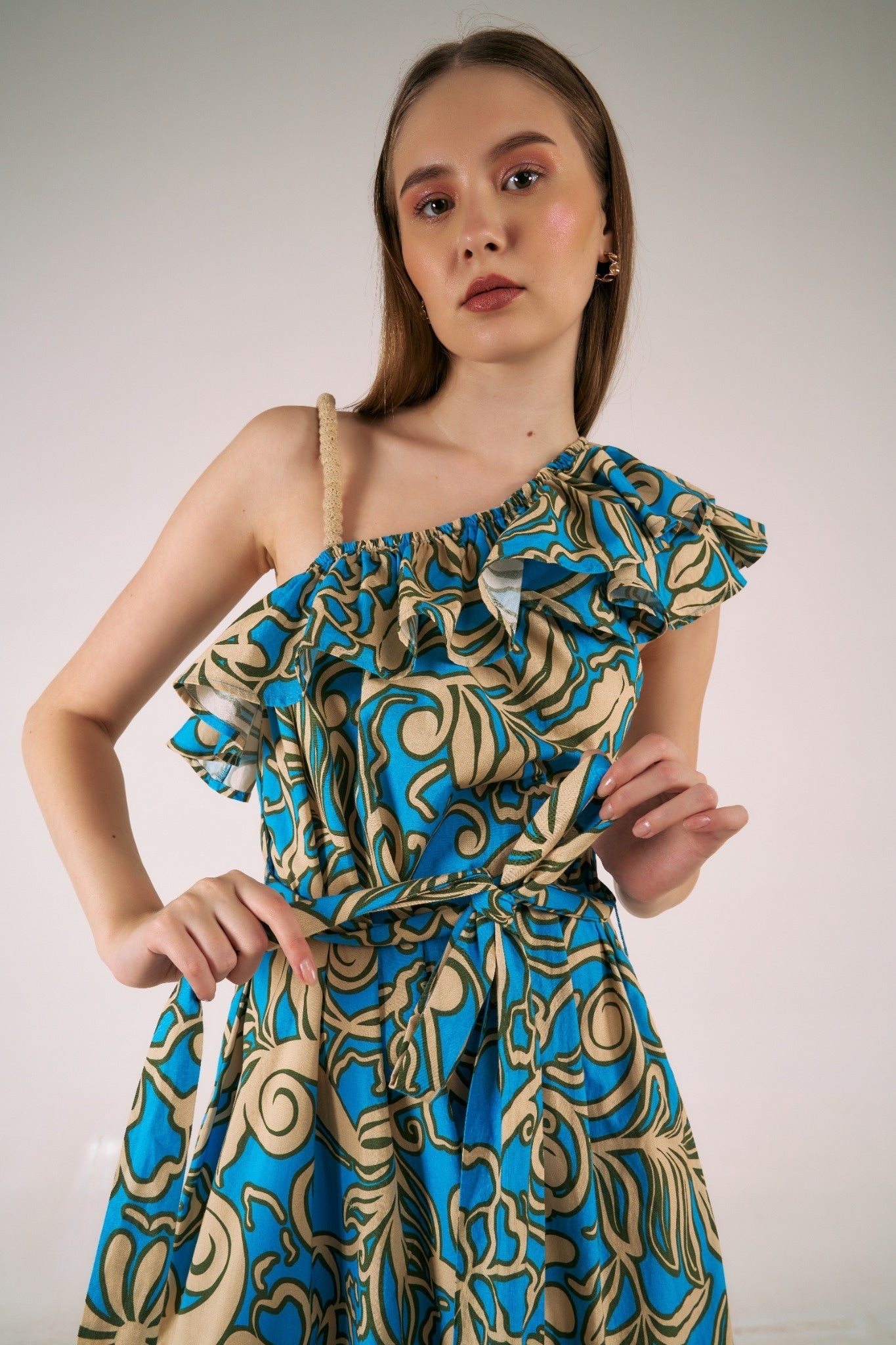 Cotton poplin printed 1 shoulder maxi dress with ruffle at neckline and crochet balls at shoulder strap.