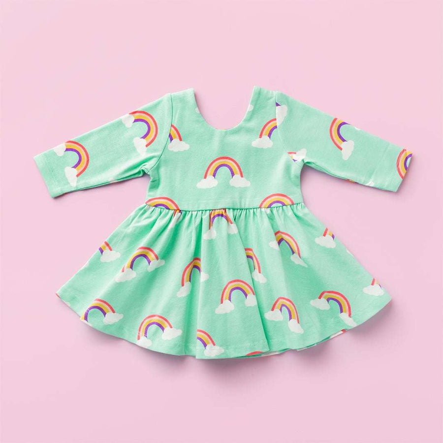 However you style it, with a sweatshirt underneath, short sleeve tee under and cardigan over - we're huge fans of this unique number. Featuring little cap sleeves and bow ties at the back, generously shirred skirt and super soft quilted cotton jersey lining it's a sure show stopper.