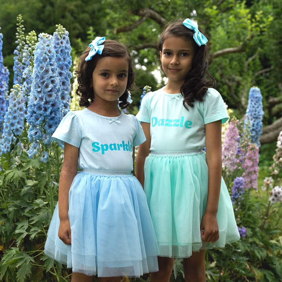New! Perfect t-shirt and tutu set has arrived! Comprising of soft jersey t-shirt with glitter 'Dazzle' detail and matching mint tutu skirt, designed for every playtime's jump, skip and twirl! Collect all colours in pink, lilac & blue.