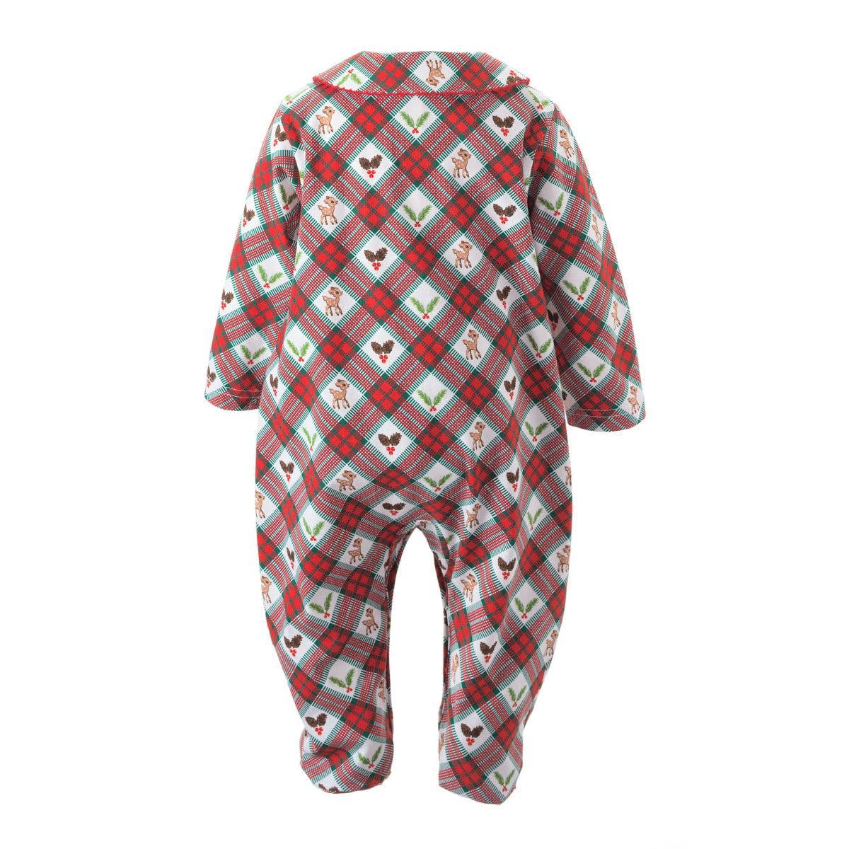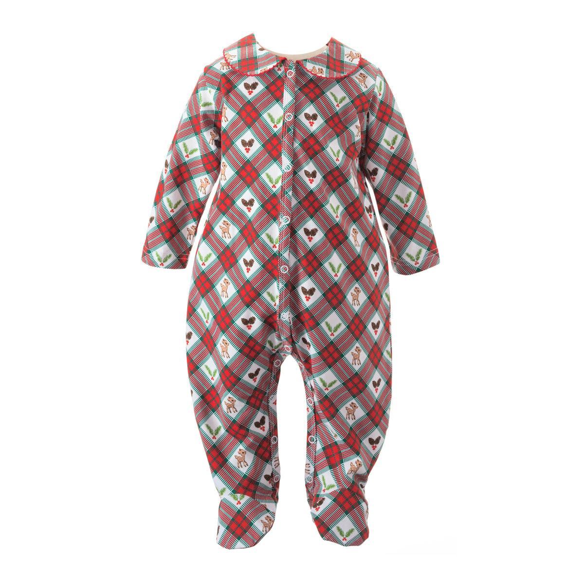 Tartan and playful fawn print, with our signature peter pan collar trimmed with red picot. Snap fasteners at front and inner leg for easy changing.