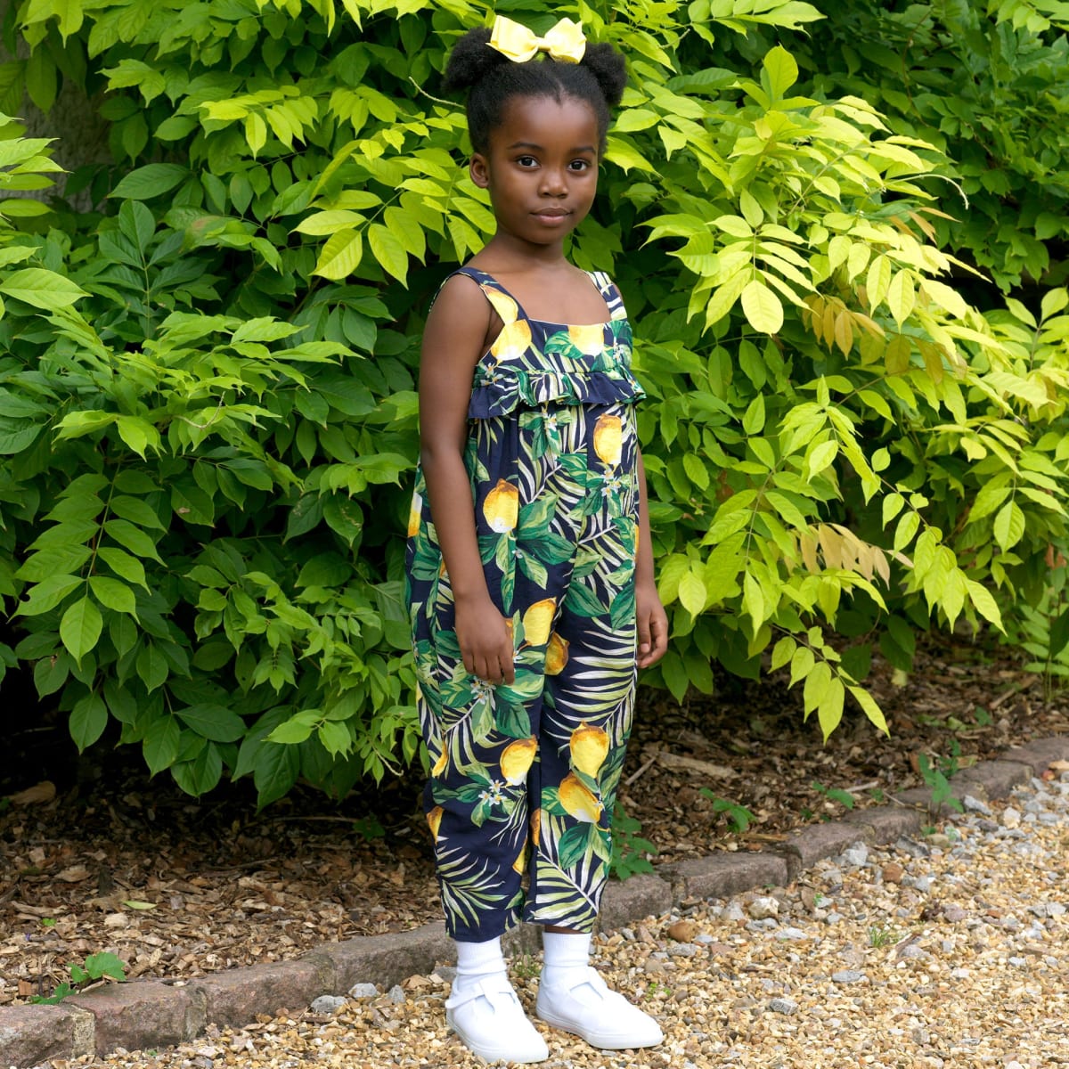 Get ready for some summer fun with our Lemon Ruffle Jumpsuit! This playful jumpsuit features a stylish lemon print on a dark navy base, with ruffles around the chest and back. The wide straps and button opening at the back make it easy to put on and take off. The wide fitting on the bodice ensures a comfortable and elegant look for your little girl.