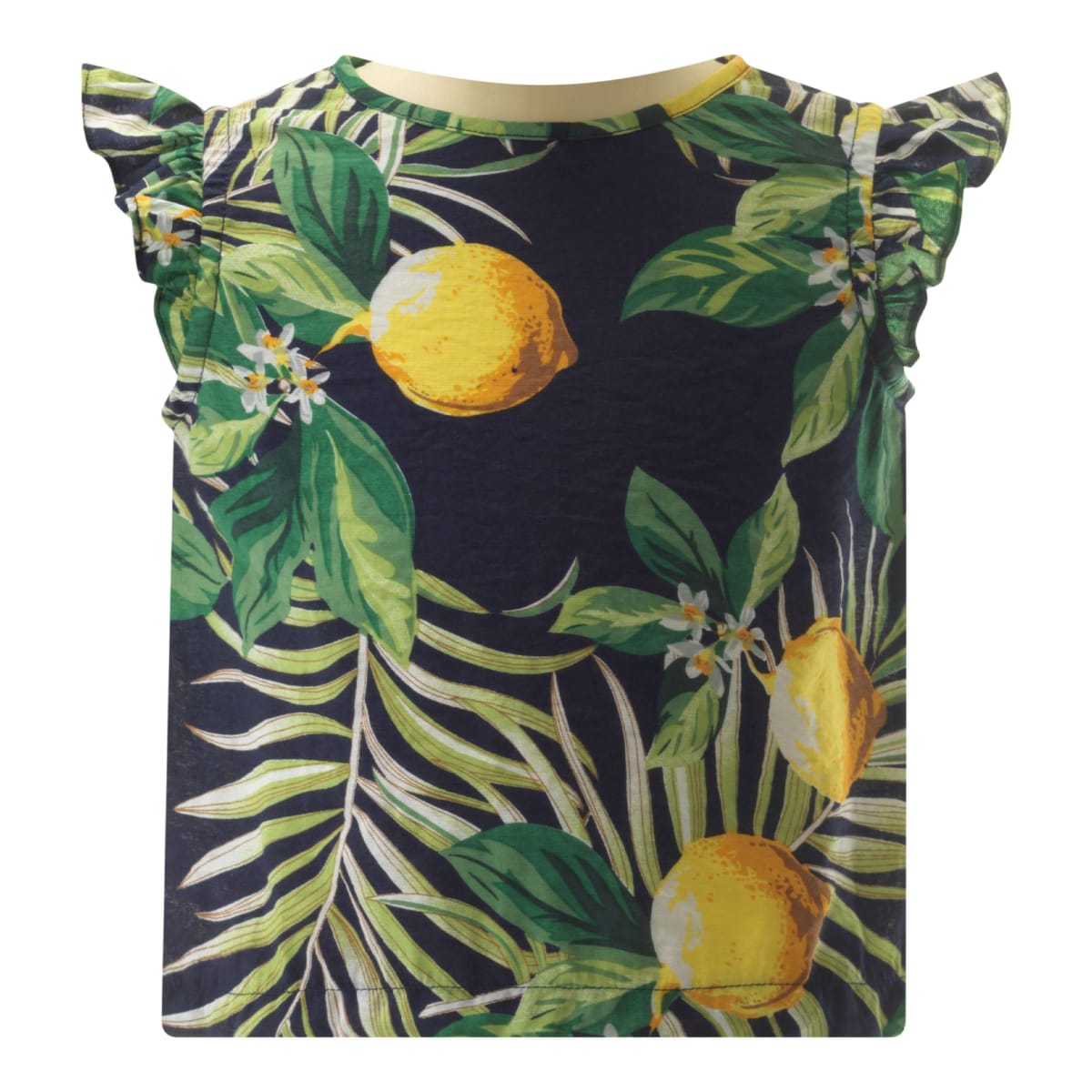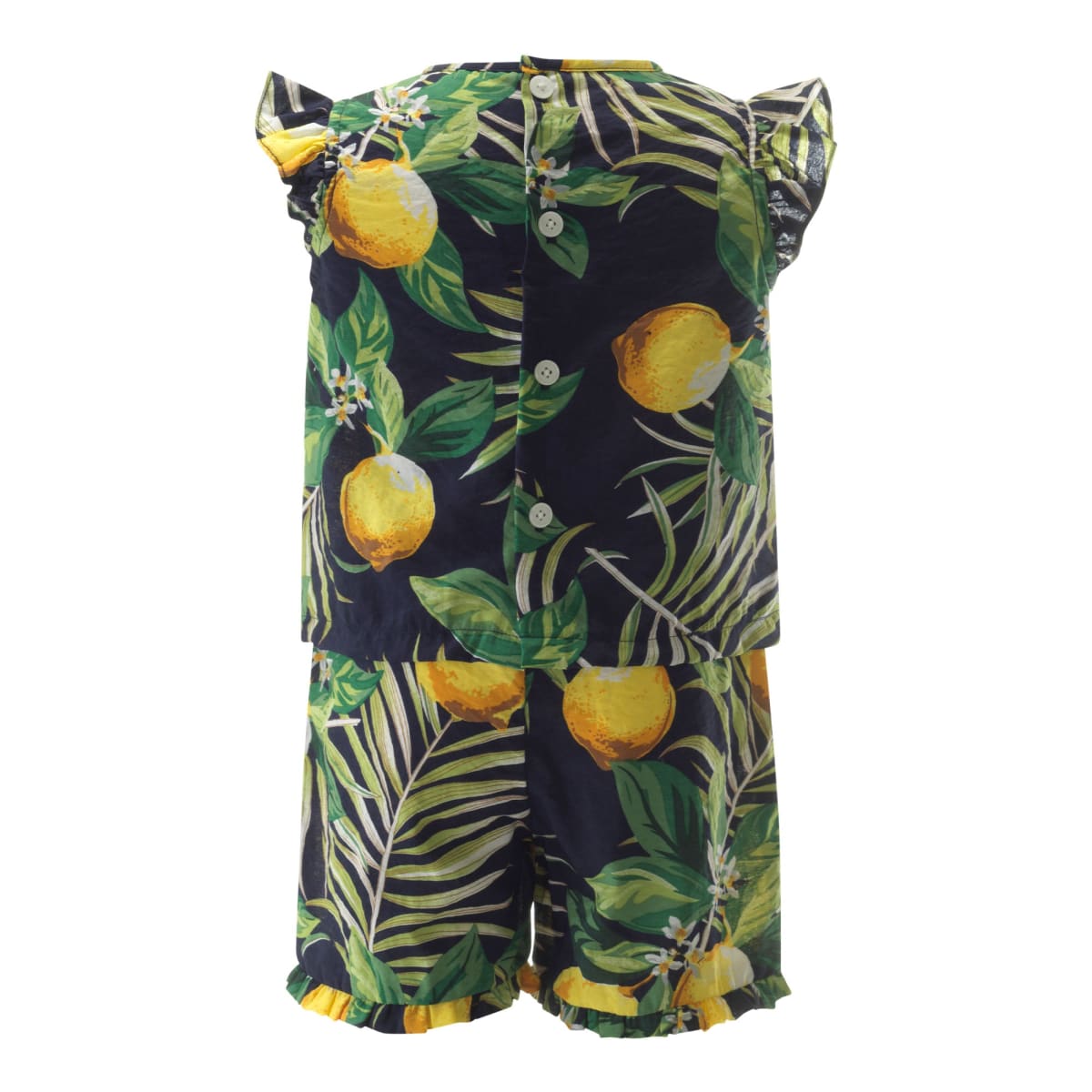 Unleash your little girl's playful side with the Lemon Ruffle Set! This stylish summer outfit with a fun lemon print on dark navy, features a boxy top with adorable ruffles around the shoulders and matching shorts with ruffles on the bottom hems. Perfect for easy summer days and vacation, this set will keep your child comfortable and stylish all season long.