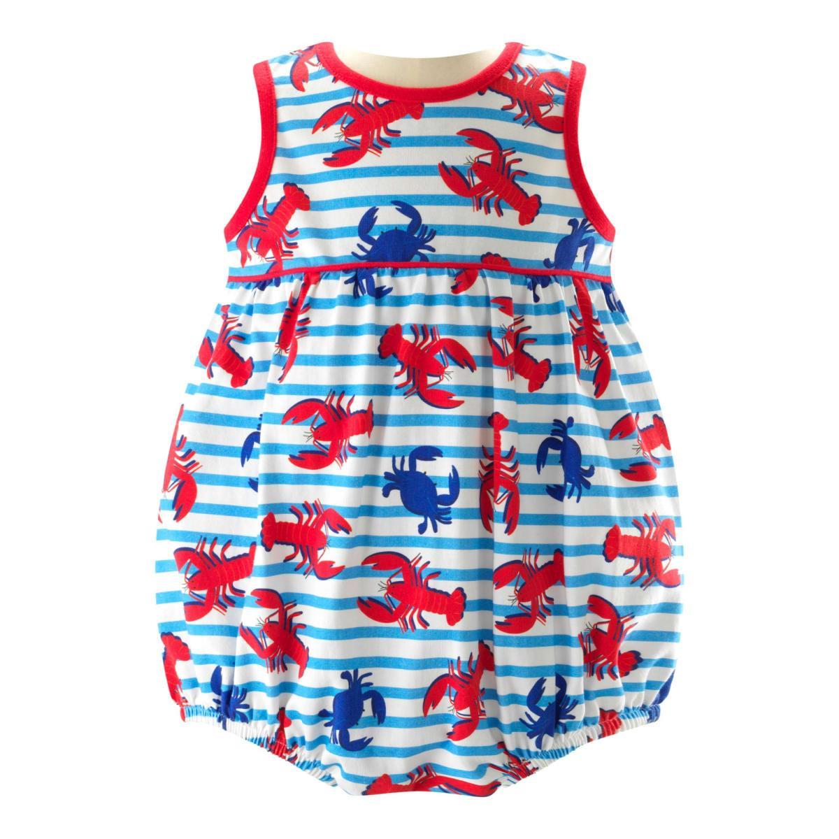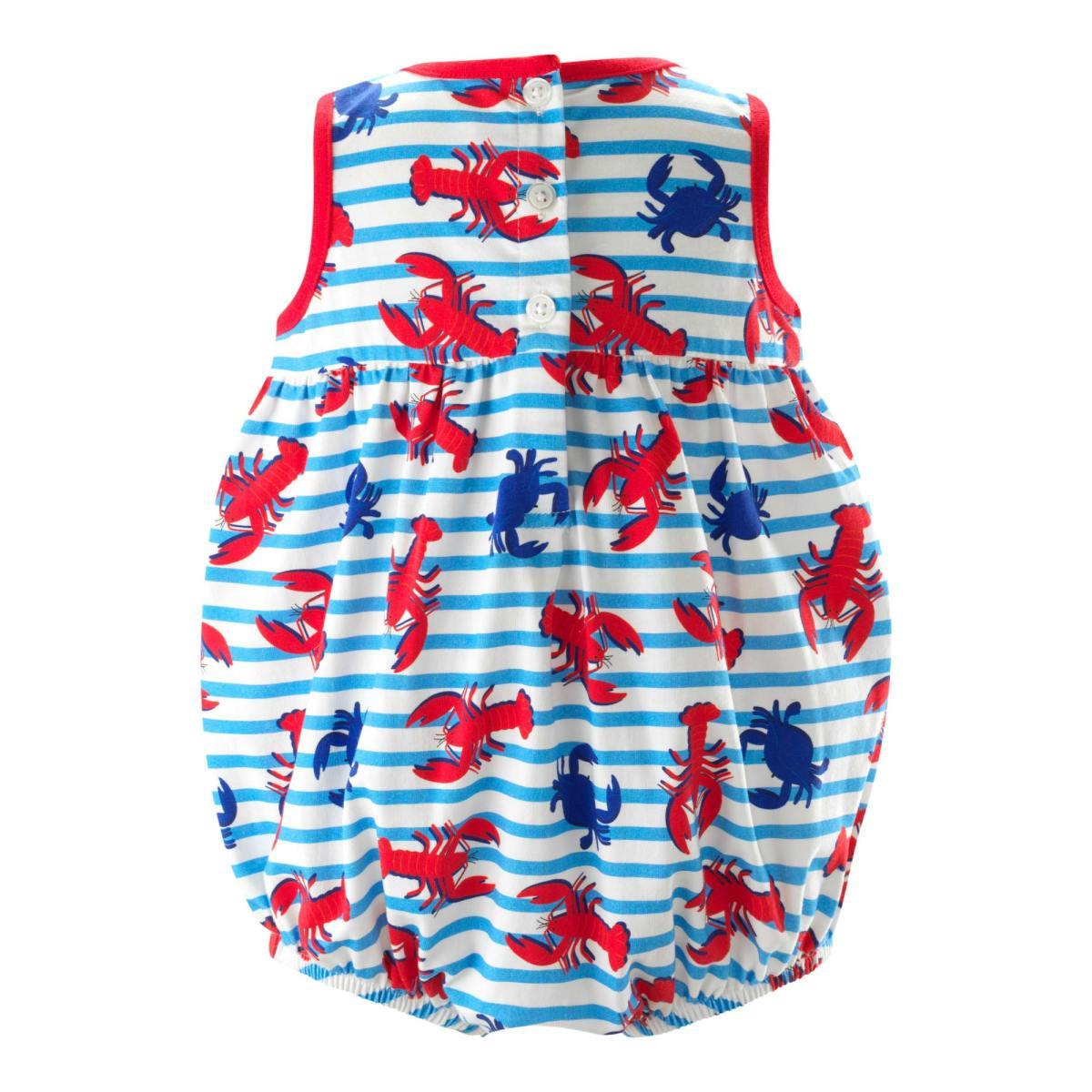 Get ready for summer fun in this adorable bubble-shaped jersey romper! Featuring a playful lobster print on blue and ivory striped background, with red piping details and a gathered waist for a puffed effect. Complete with a button opening at the back, this romper is perfect for any little adventurer on the go! Coordinating print in a Baby Girl's Dress and Boy's Polo!