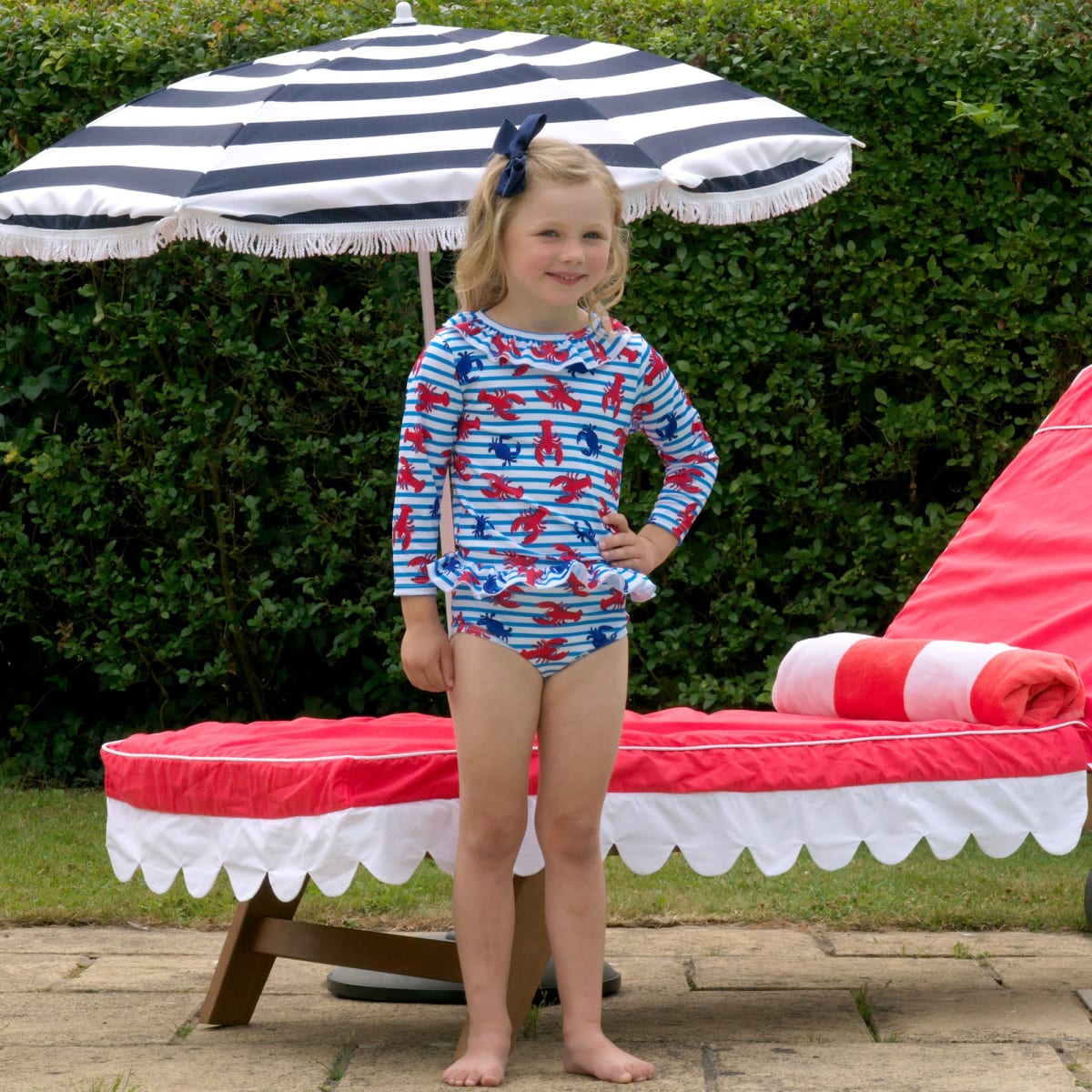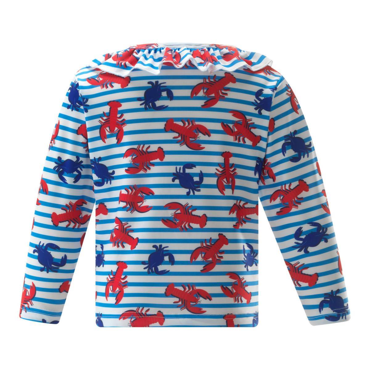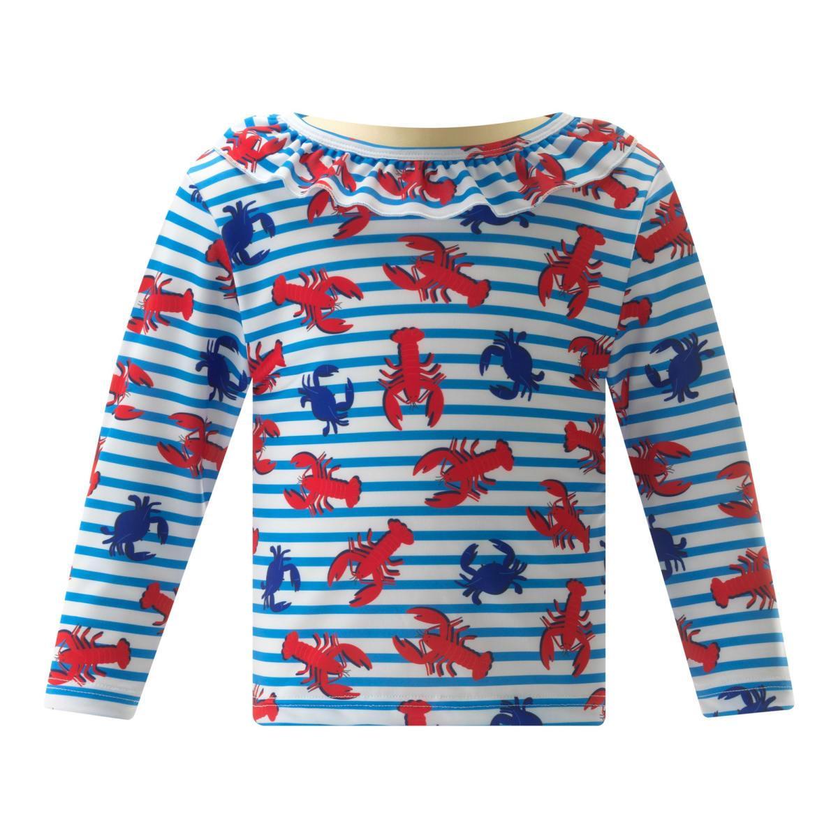 This adorable two piece rash guard set features a fun, blue and red lobster print. With long sleeves and frills on the neckline and bottom. Coordinating style available in Baby.