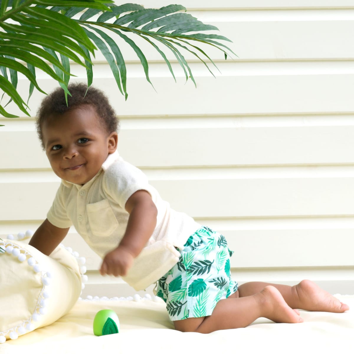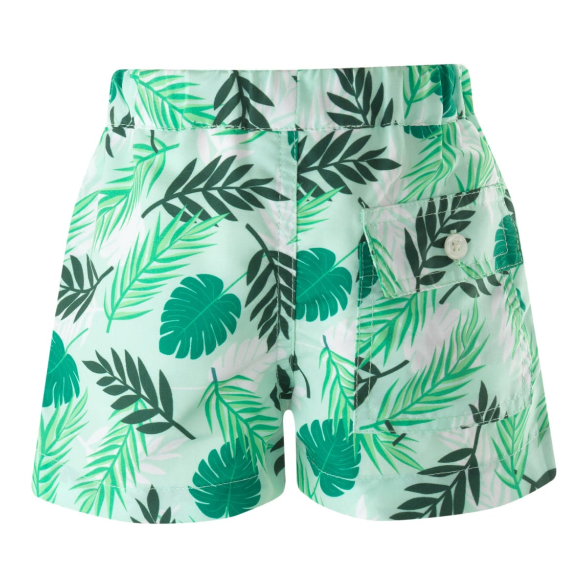 Woven swimshorts with a palm tree print. Elasticated waist and mesh lining inside, decorative herringbone cord tie at front waist. Exclusive Rachel Riley print.