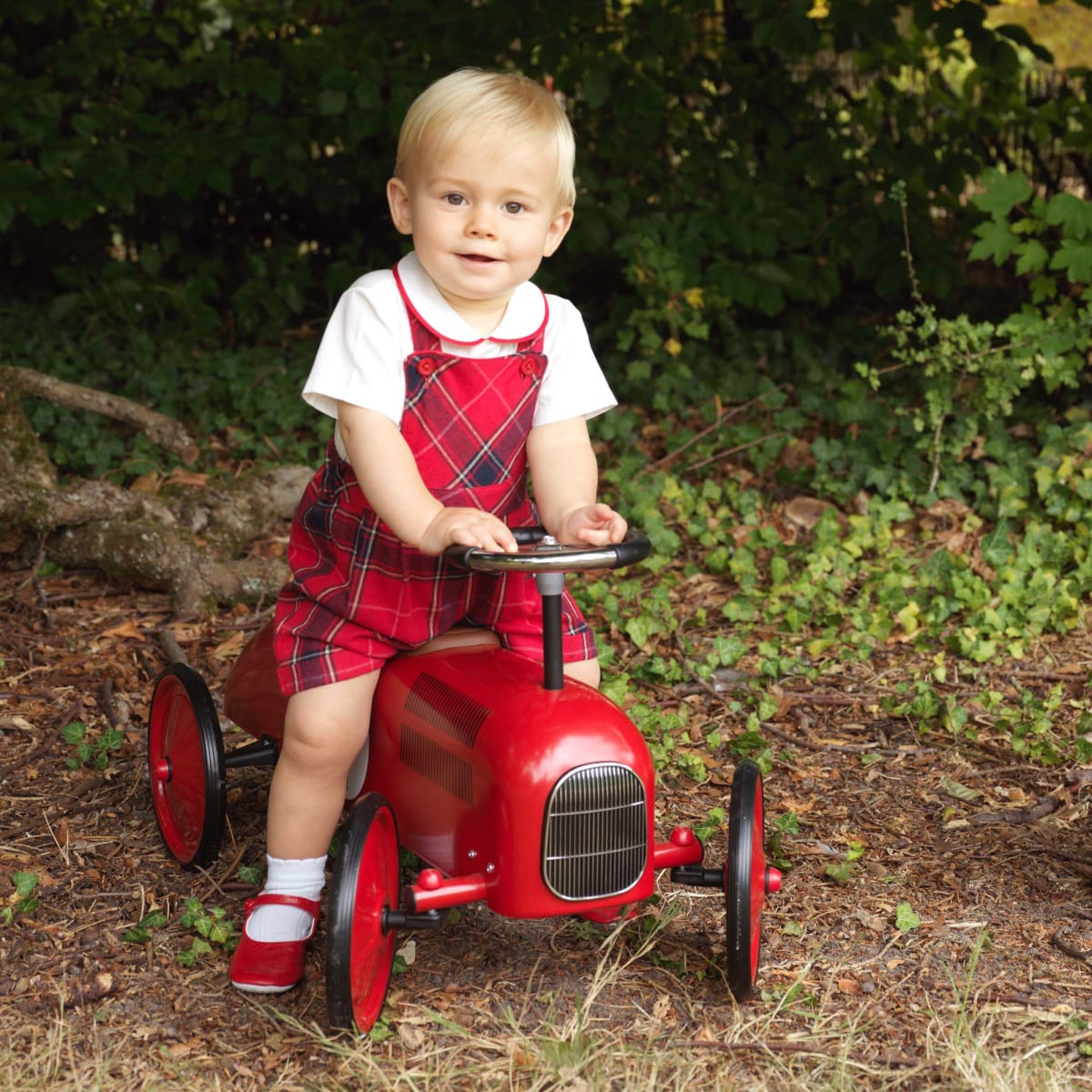 New! Dungarees in a red classic tartan. Turn up detail at leg cuff, adjustable straps and elasticated back waist for comfort and the perfect fit.