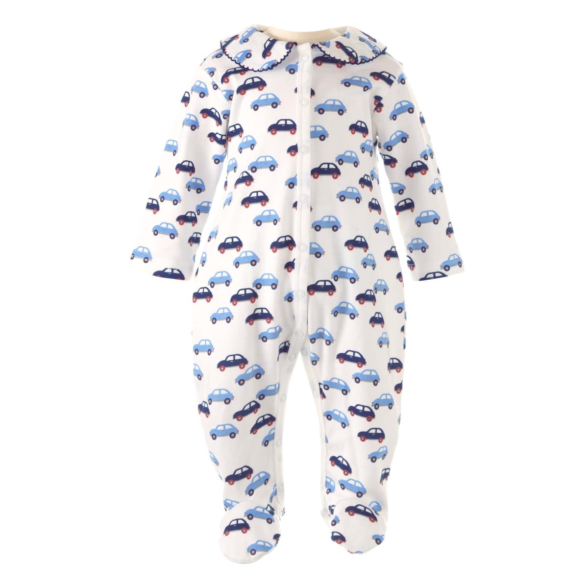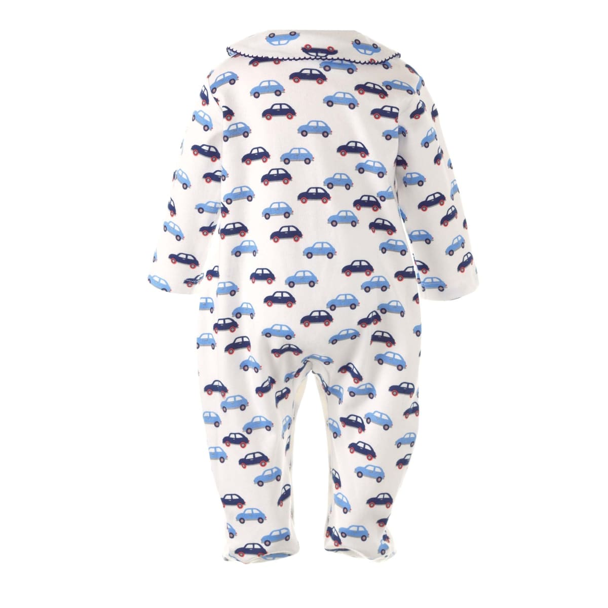 Soft and snugly, this cosy cotton babygro has a retro toy car print. With our signature peter pan collar trimmed with navy picot. Snap fasteners at front and inner leg for easy changing. Matching cardigan available. Exclusive Rachel Riley print.