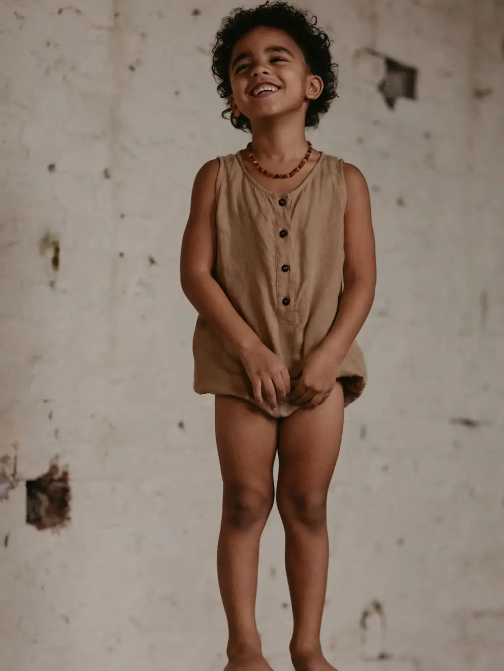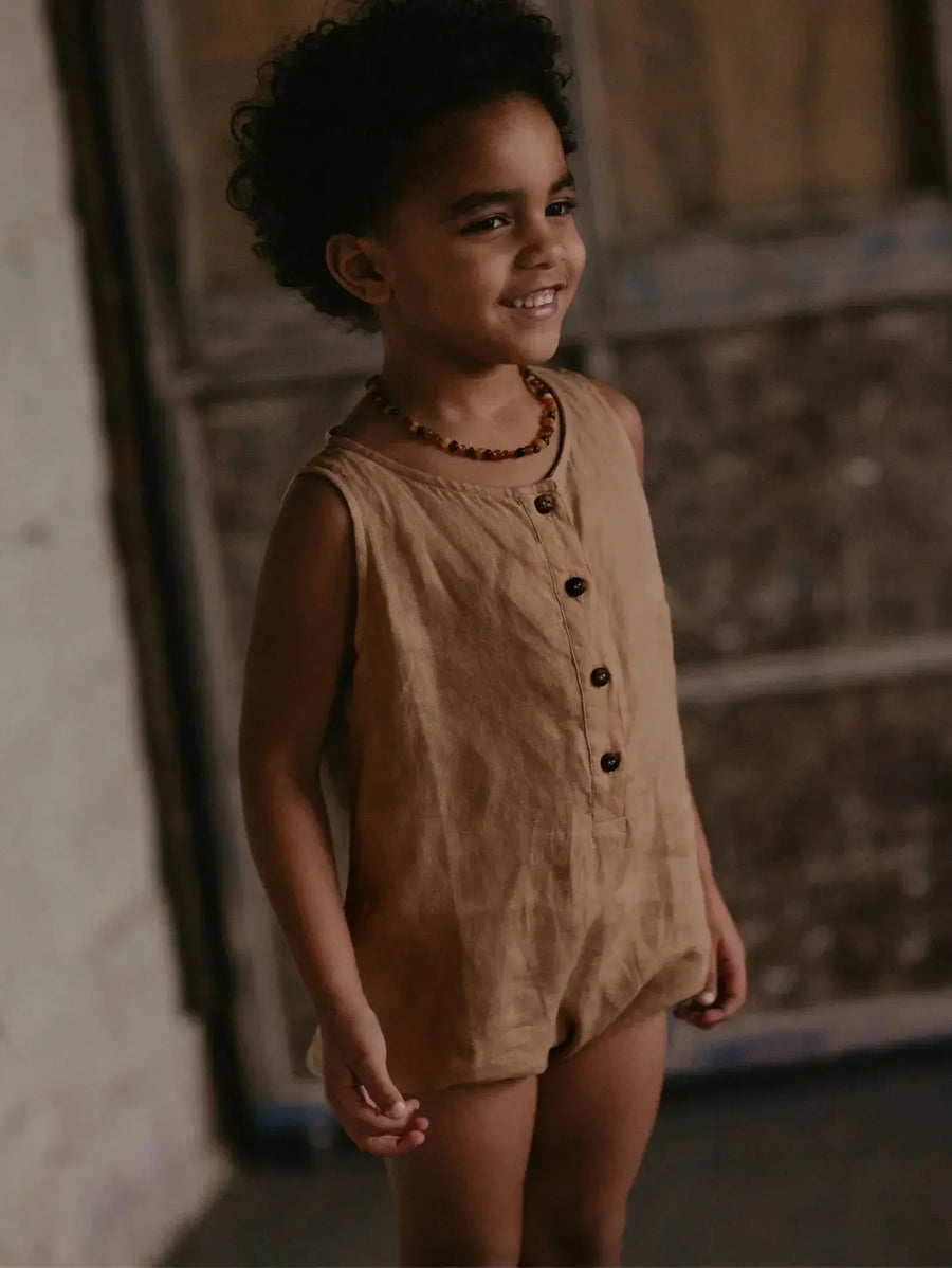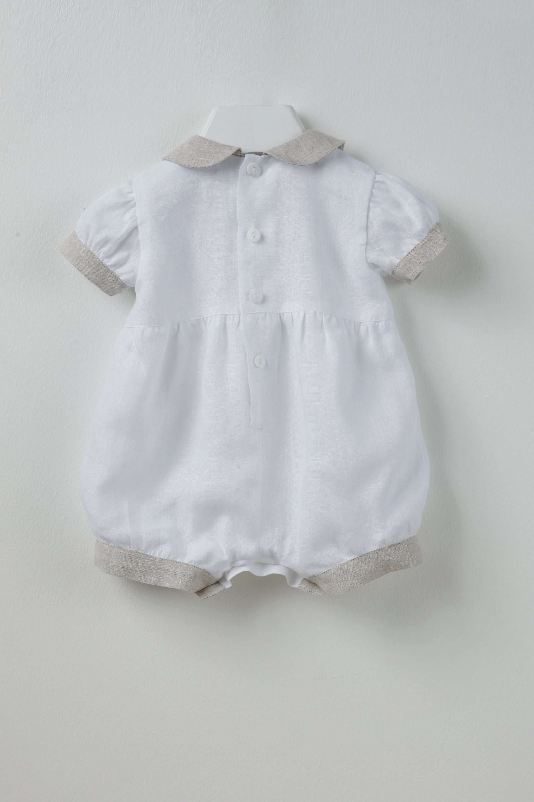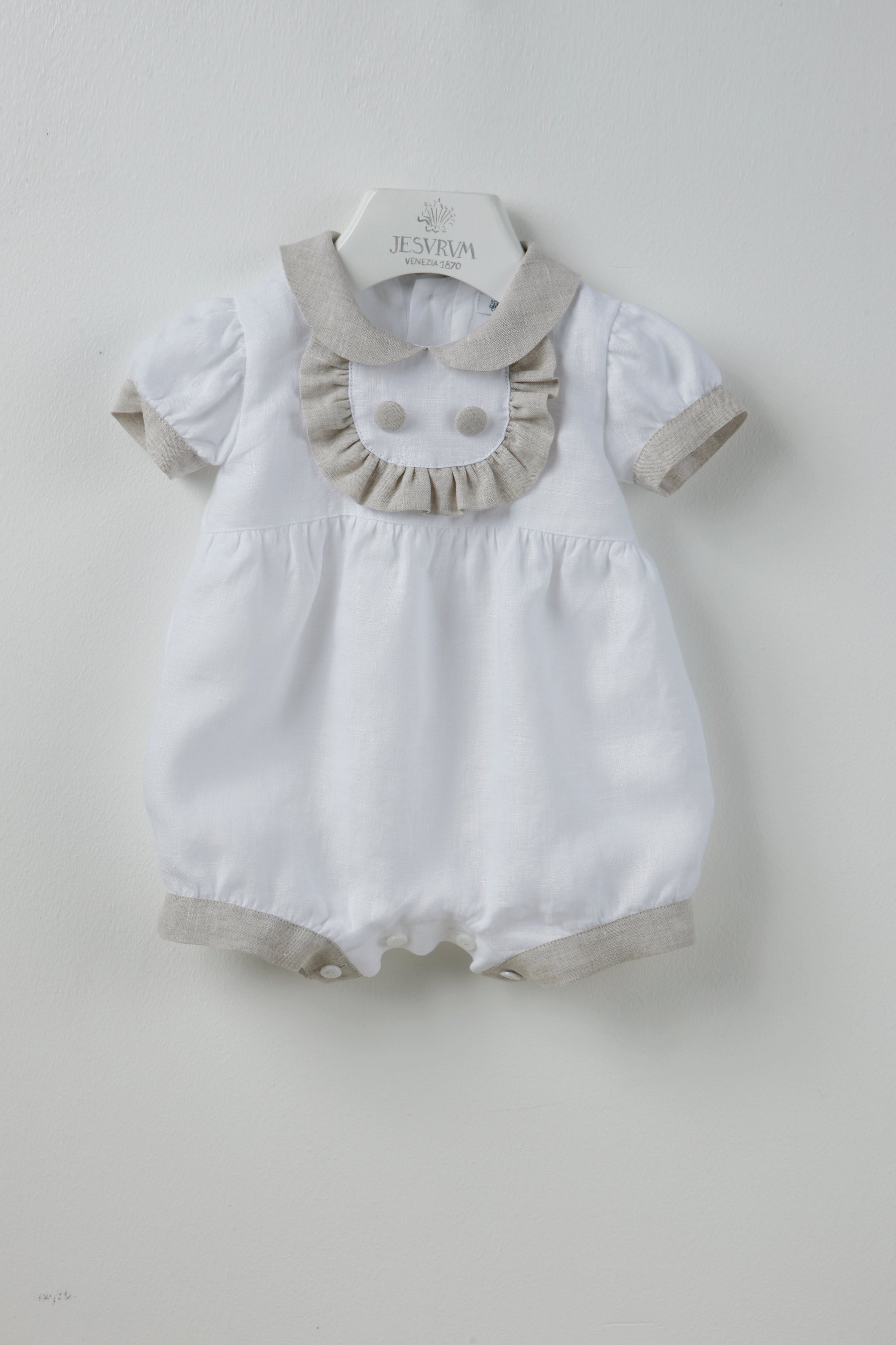 White linen fabric for this romper with beige bottons and details. 100% made in Italy