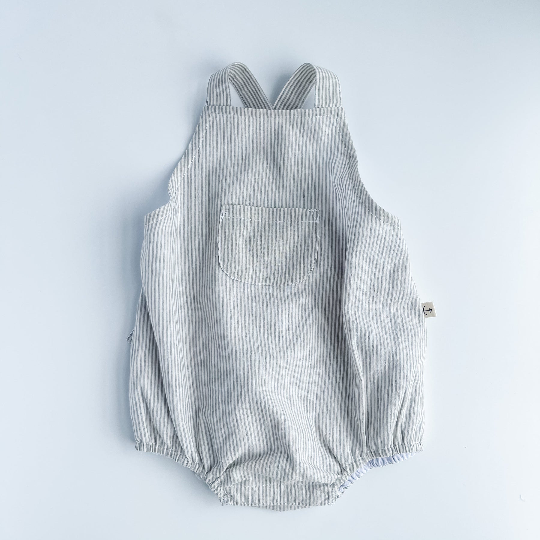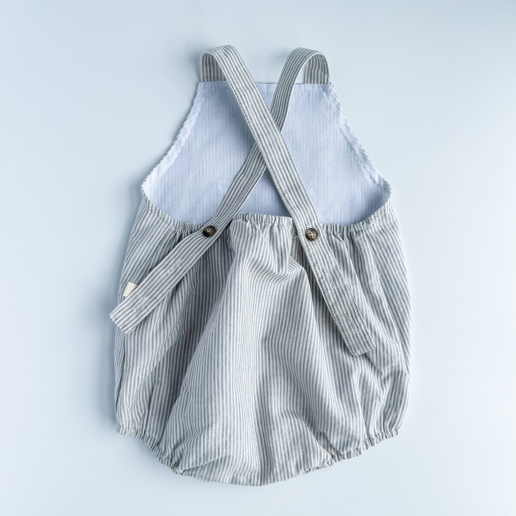 Super soft vintage inspired gender-neutral grey striped cotton bubble, lined in white cotton with adjustable button holes to customize fit and beautiful tortoise shell button detail at back. Perfection on its own in warm weather. Pairs well with cozy tee in gray or oatmeal knit for cooler temps. Lovely on girls with Peter Pan liberty floral shirt. Snaps at bottom for easy changes. This style will carry you easily into summer. Truly an heirloom piece. This item is a favorite of In Style editor, Laurel Pantin, whose little Phoebe couldn't look any cuter. Sizes 0-3m-2/3y 100% cotton Machine wash, tumble dry low.