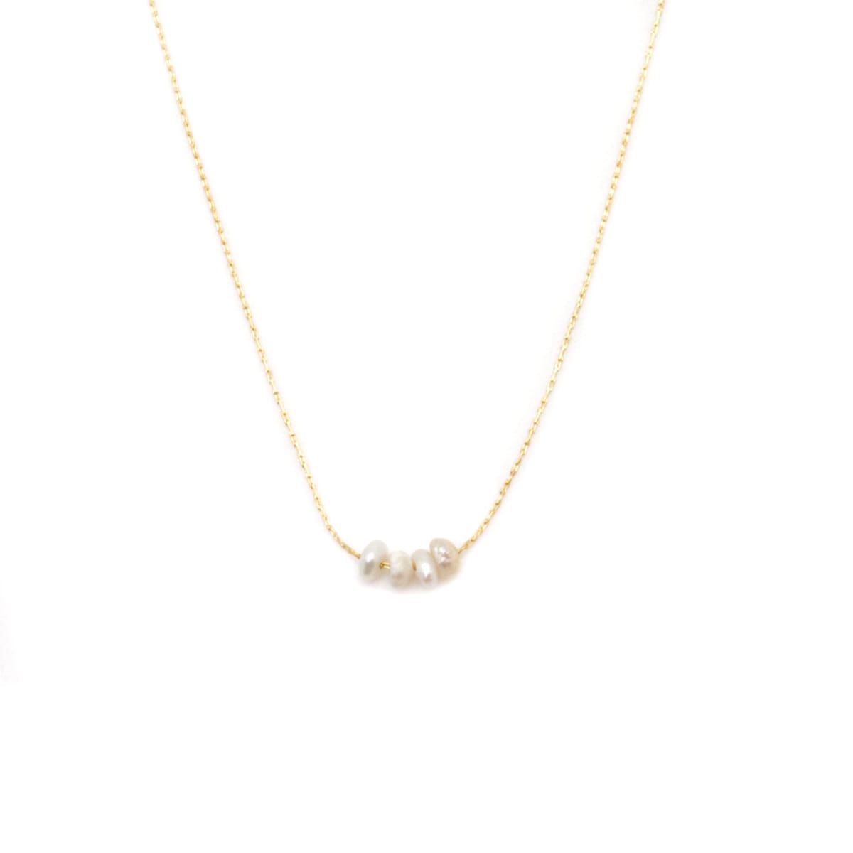 Sweet, Simple, Salty. Our elegant thin gold chain necklace accented with four tiny white pearls... subtle and timeless this piece has the elements of the oceans whisper.