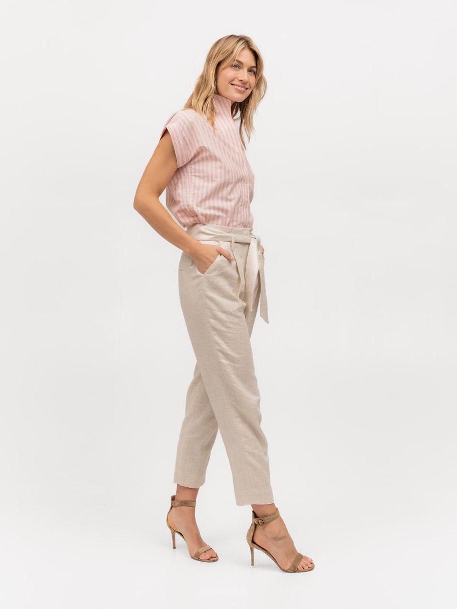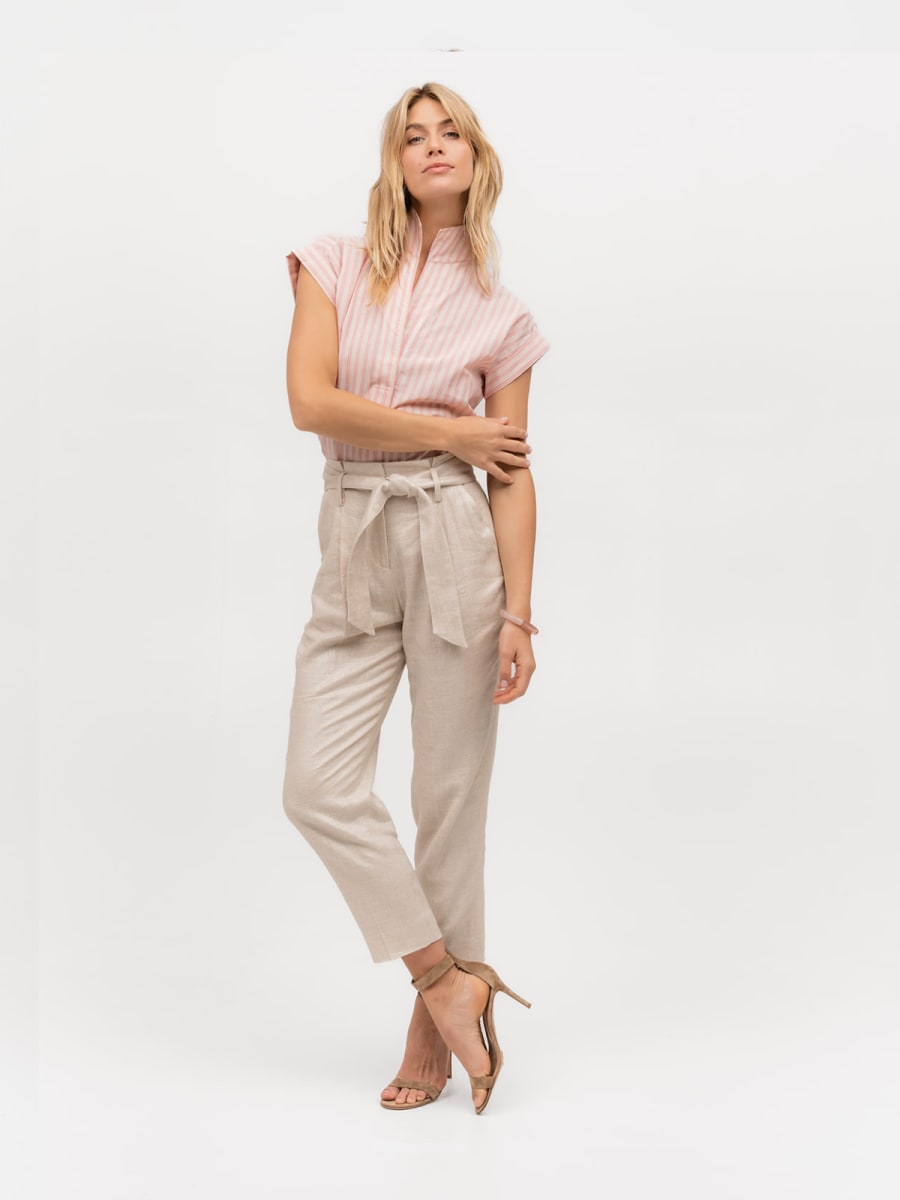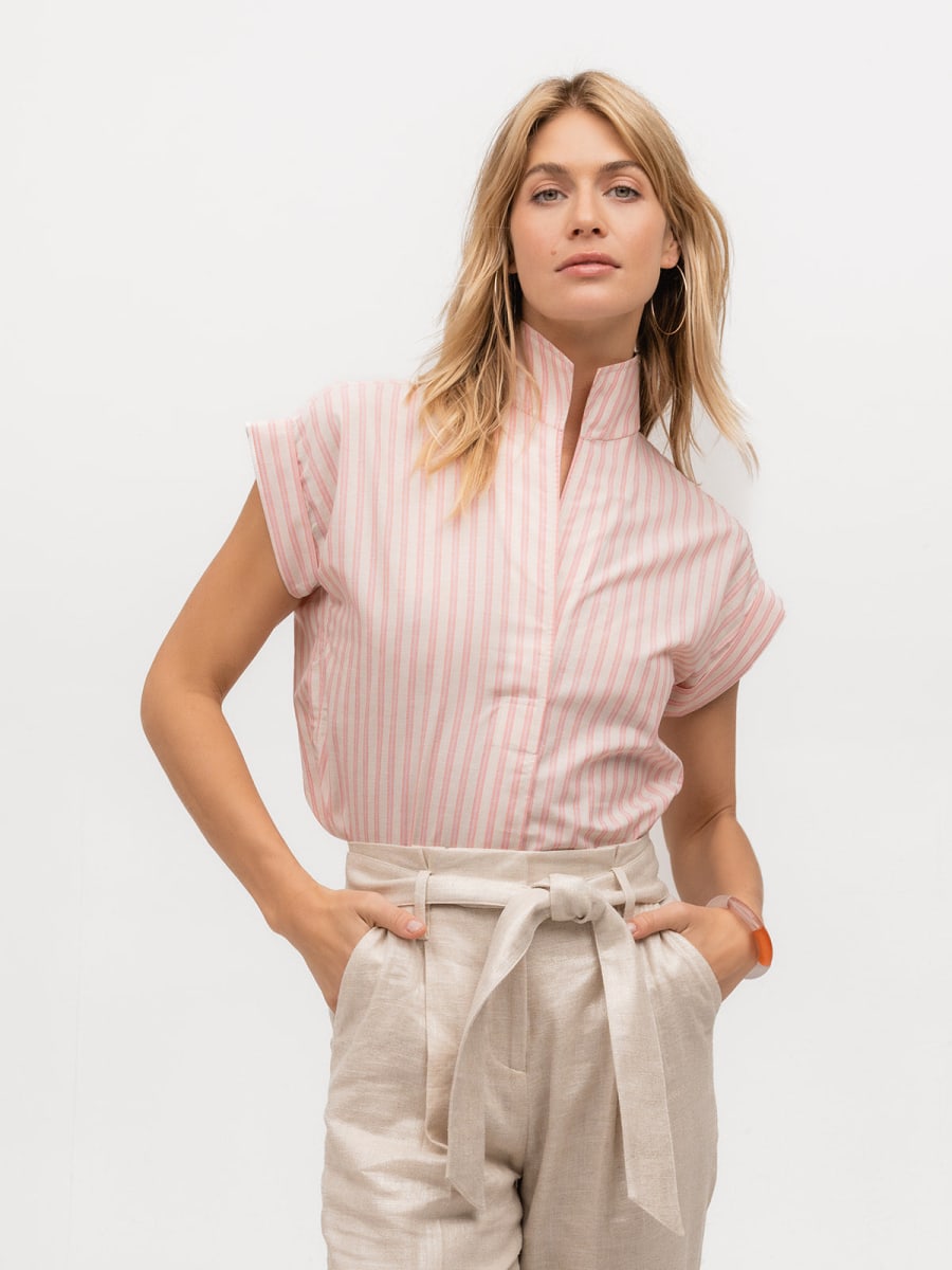 Our warm-weather must-have Cap Sleeve tunic-style shirt in a sweet khaki and neon pink uneven stripe cotton/linen blend.
