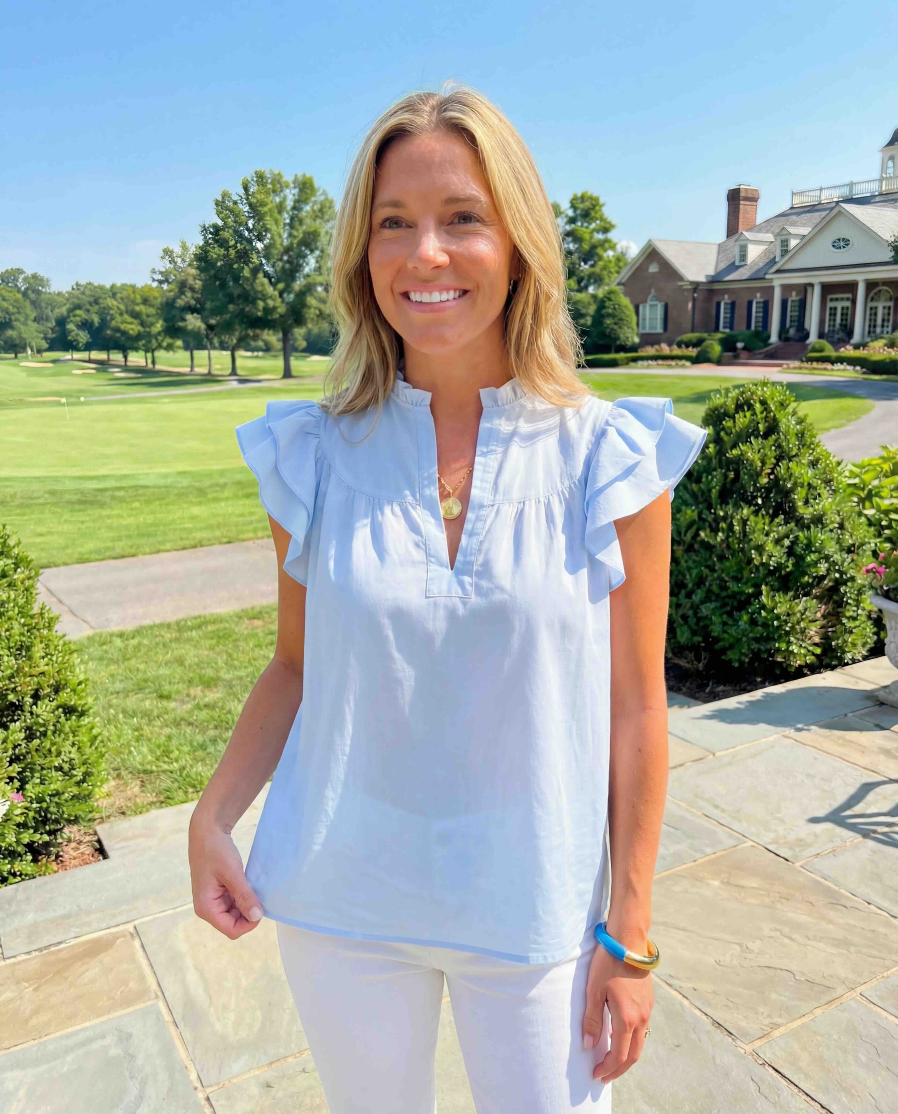 Our playful Flutter Sleeve top perfect for warmer weather in a lightweight pale blue voile.