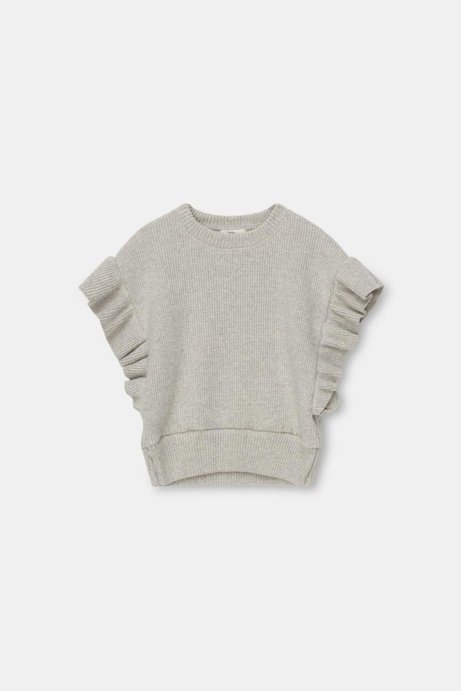 This ribbed vest features ruffles on the sides, from the shoulders to the hips. It has a crew neck and side slits.