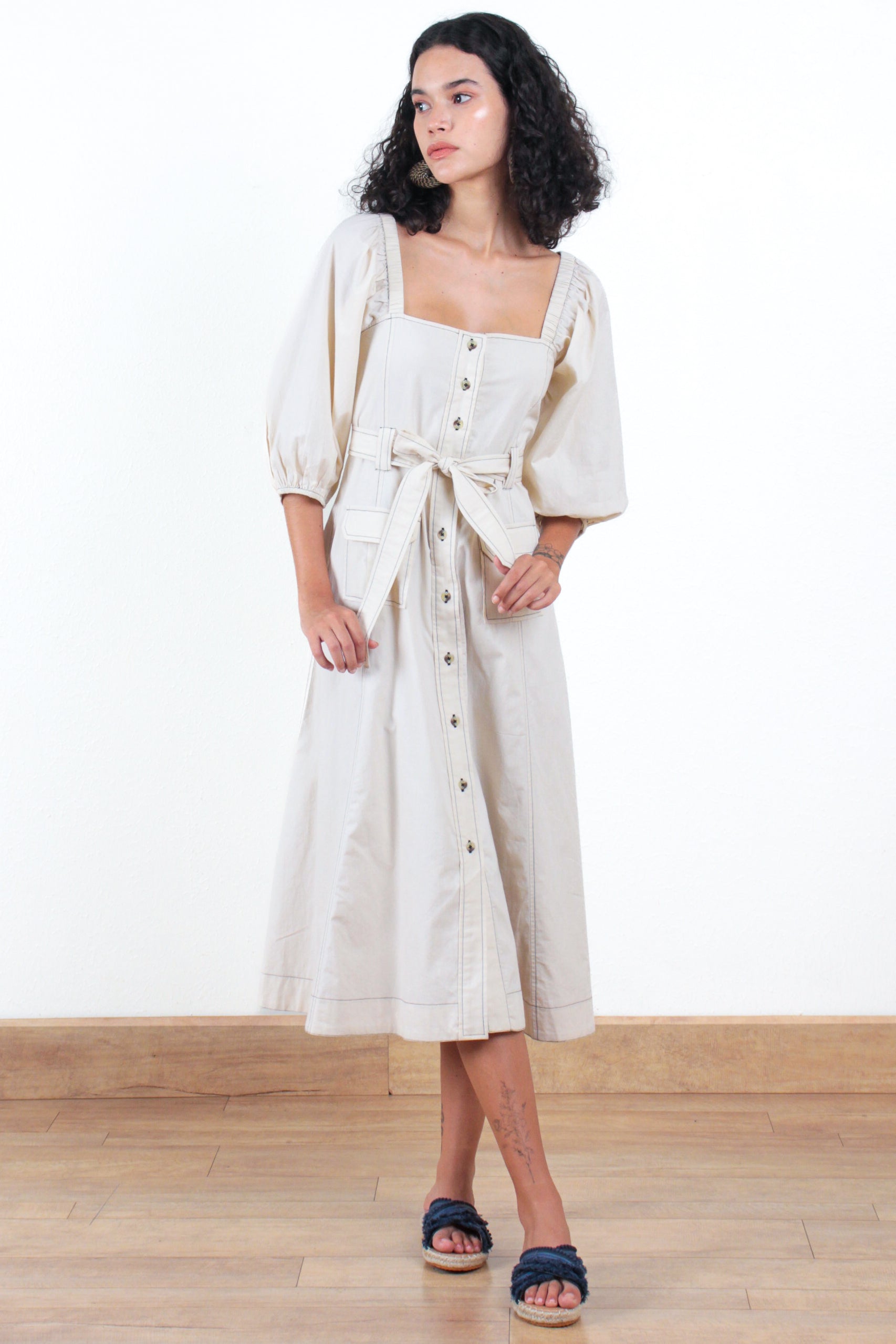 Cotton poplin Midi dress with cargo pocket details and a front placket with buttons. Elastic at shoulders and at cuffs. Lined.