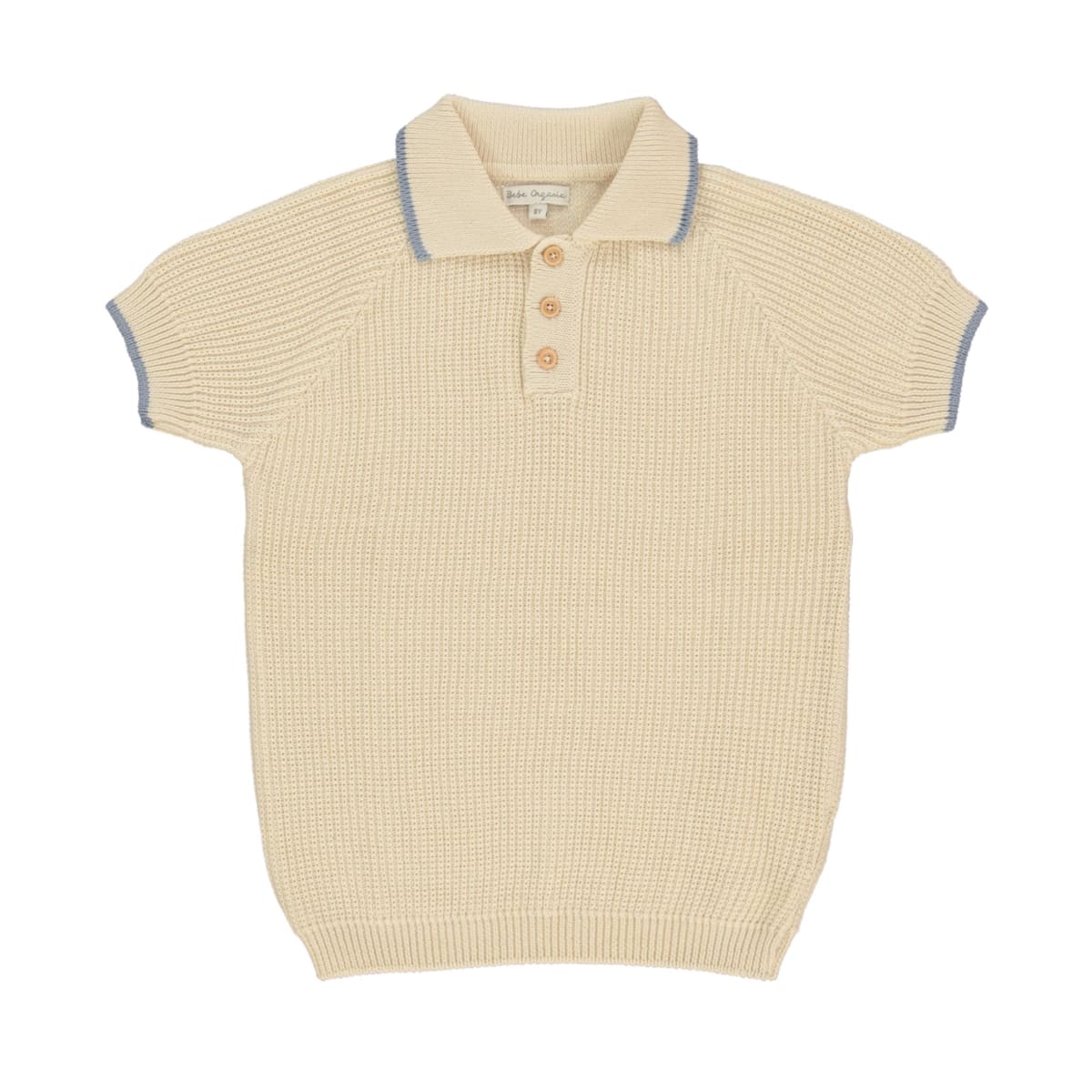 Vintage-inspired Kane shirt in organic cotton waffle knit in natural undyed color with sky blue stripe detailing. The versatile polo features short sleeves, a classical polo collar, and a front opening with wooden buttons, rib cuffs, and hem.