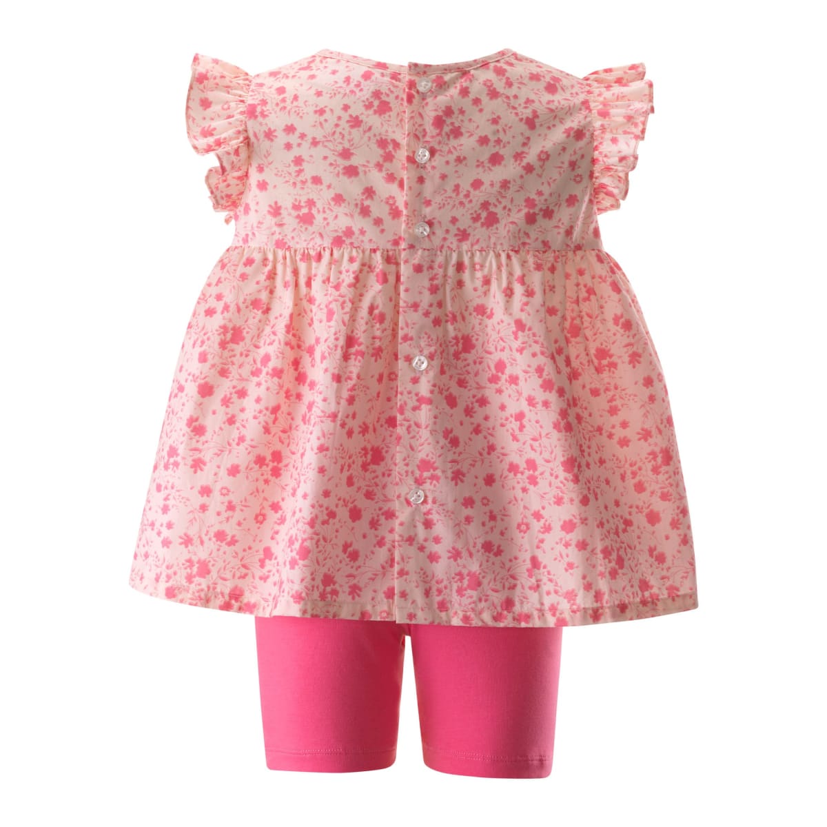 This playful two-piece set features a pink gathered top with a charming flowerette print, finished with frilled shoulder details and a sweet bow at the chest. Paired with matching pink shorts designed for comfort and ease of movement, it’s perfect for warm-weather days and special occasions. Top Fabric: 100% Cotton Shorts Fabric: 95% Cotton / 5% Elastane Care: Machine wash with similar colors. Medium steam iron.