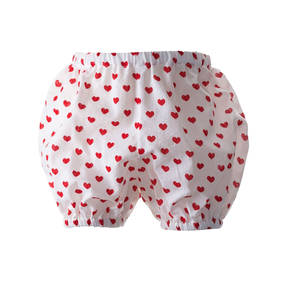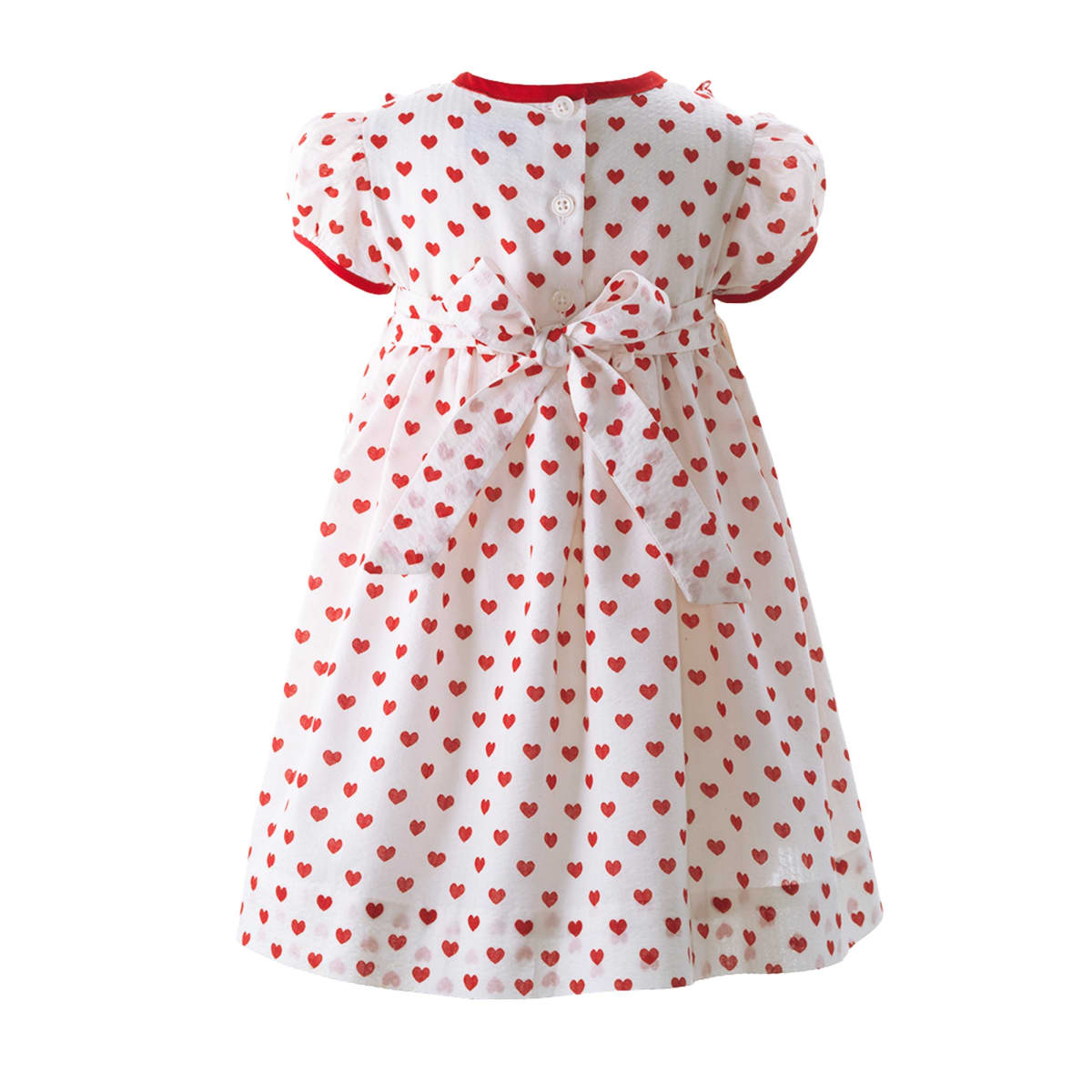 This charming puff-sleeve dress features a sweet red heart print on an ivory background, finished with delicate frill detailing at the bodice. Designed with contrasting red trim, it includes a sash tie at the back, a button-back closure, and coordinating bloomers for a complete look. Crafted from soft, fine seersucker-effect cotton with embroidered scalloped-edge frills and a full lining, it’s both comfortable and beautifully finished. Fabric: 100% Cotton Care: Machine wash with similar colors. Medium steam iron