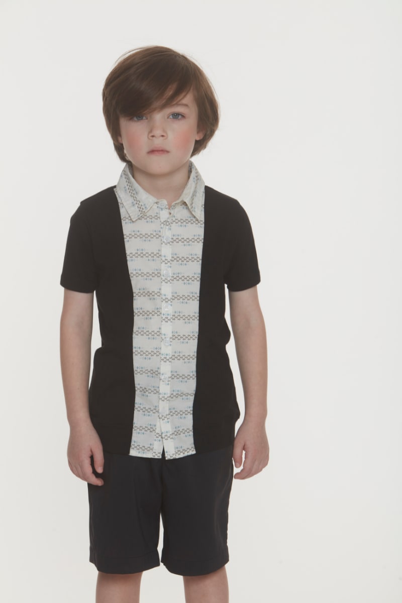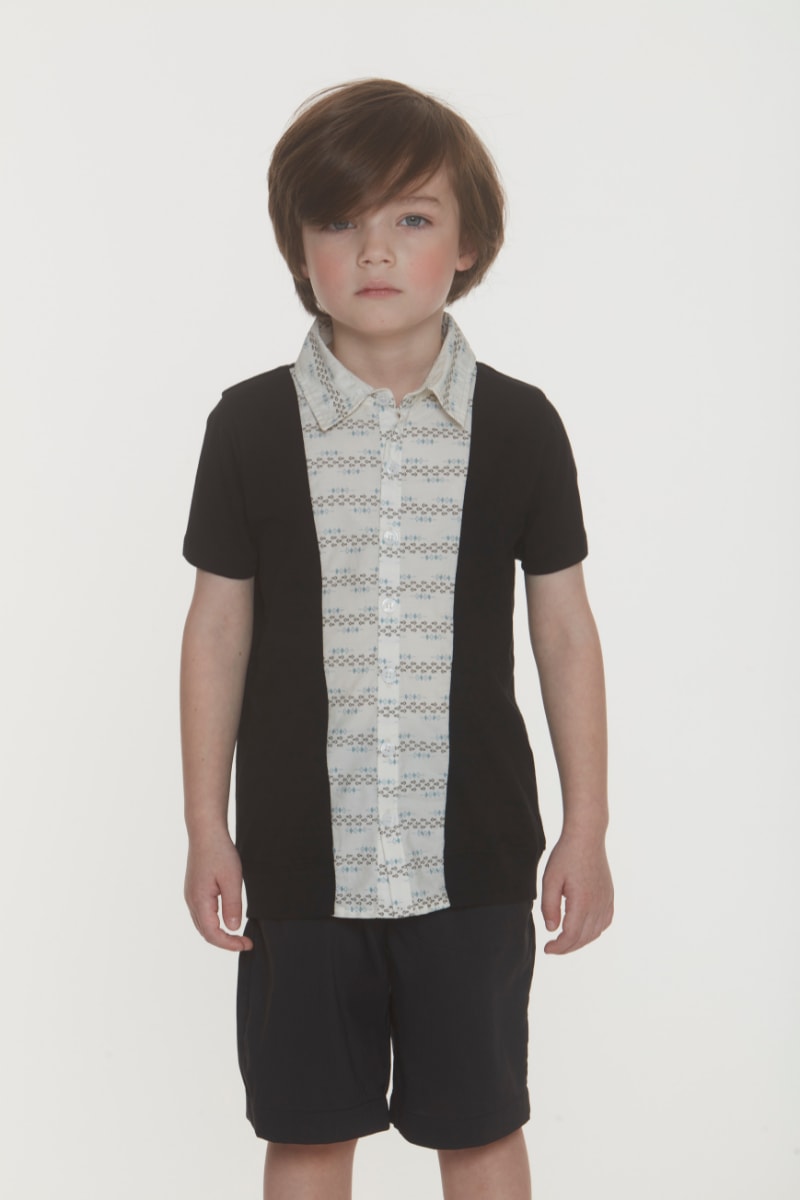 A polo styled tee-shirt with shirt fabric applique. Featured in a short sleeve crewneck design.