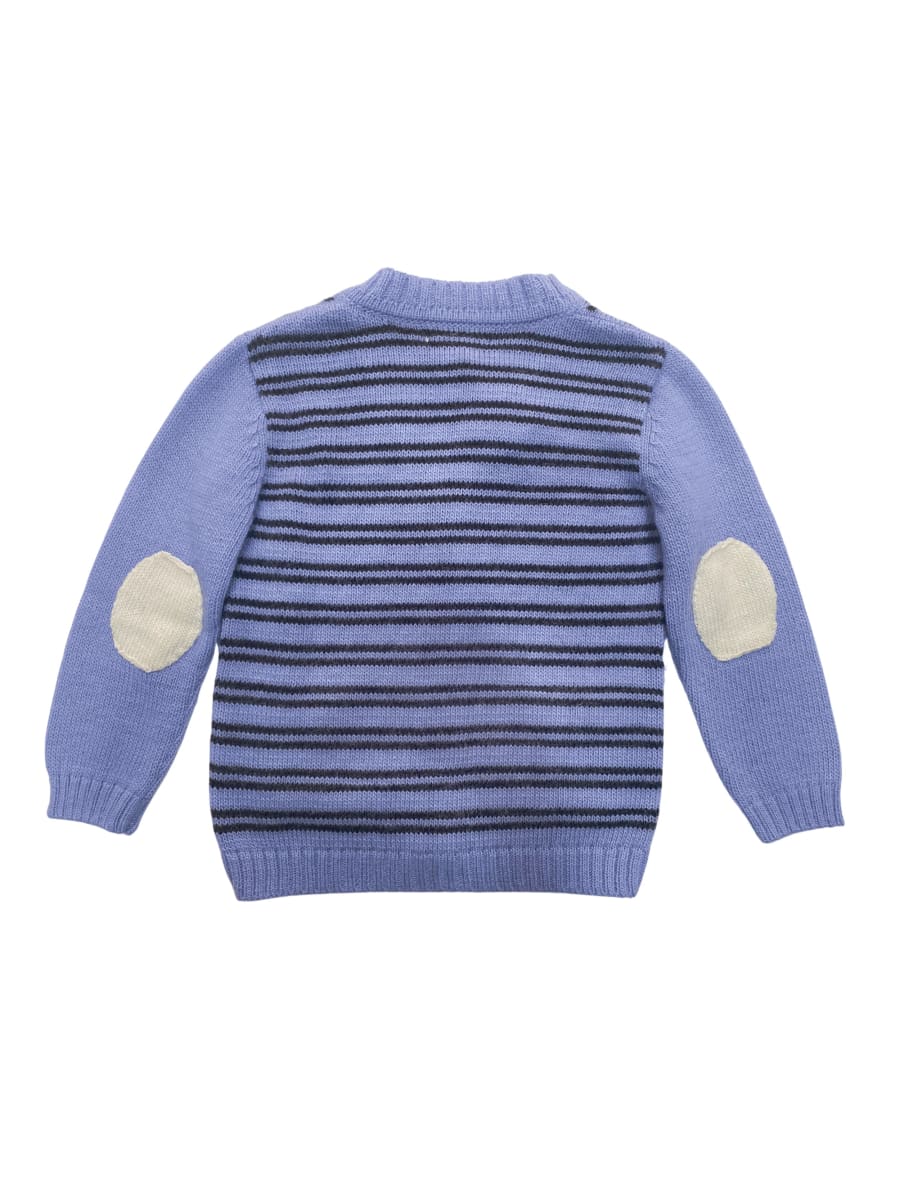 This boys' knitted cardigan features a trendy geometric pattern on the front, stripes on the back, front pockets, and elbow patches for a classic touch. Perfect for layering, this cardigan is both practical and fashionable, making it a versatile addition to your child's wardrobe. Plus, it’s machine washable for easy care!