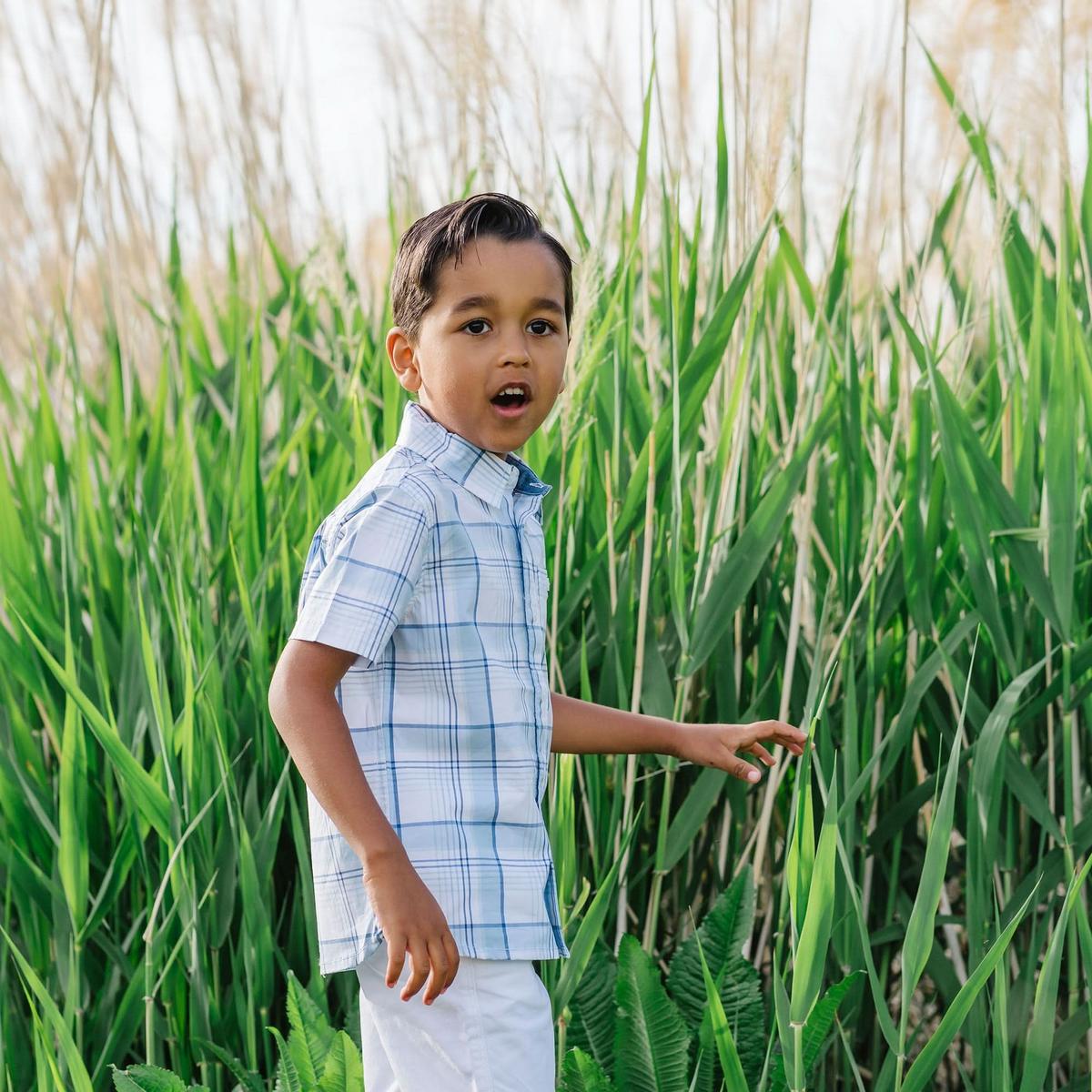 Stretch Short Sleeve Button Down Shirt - Classic Blue Tonal Plaid