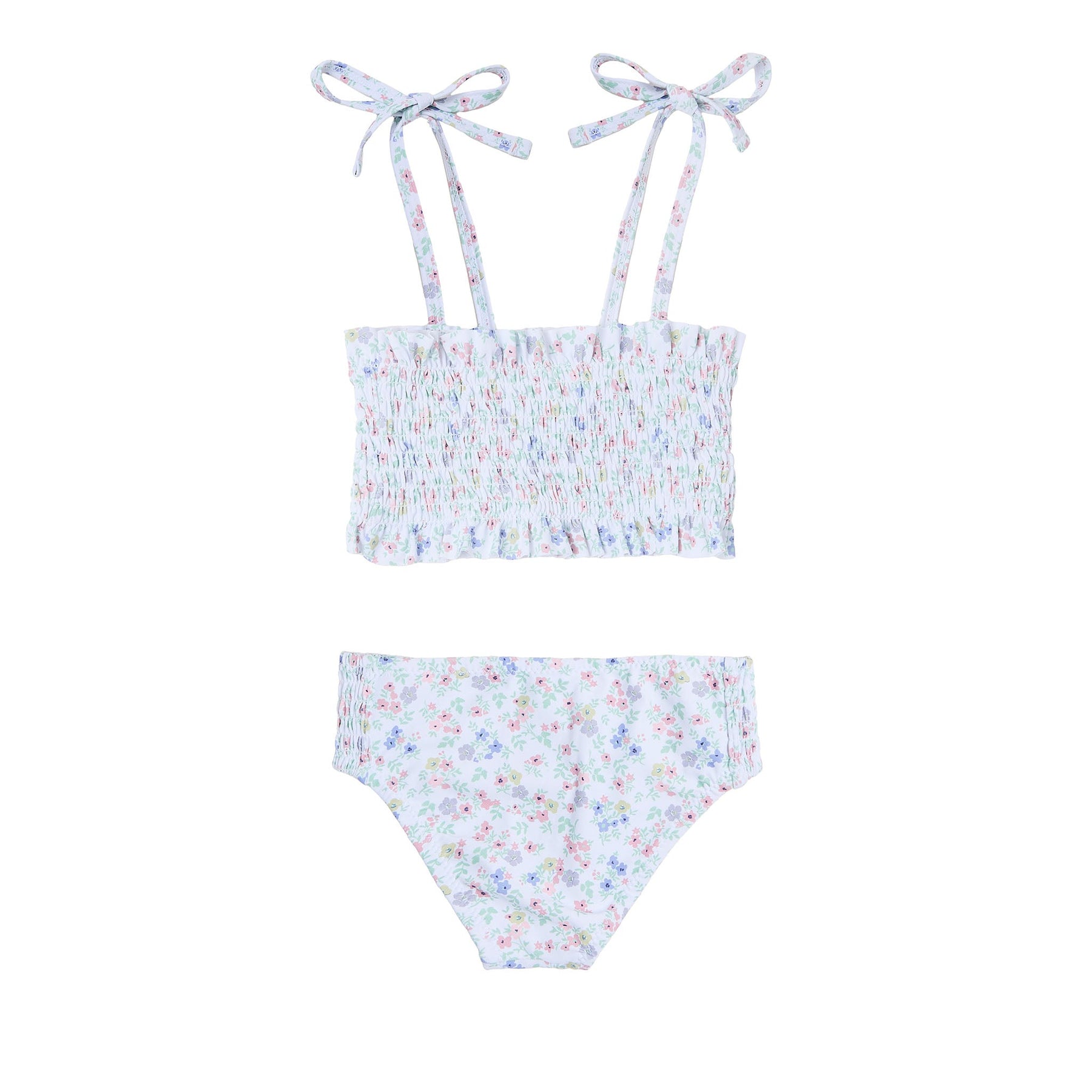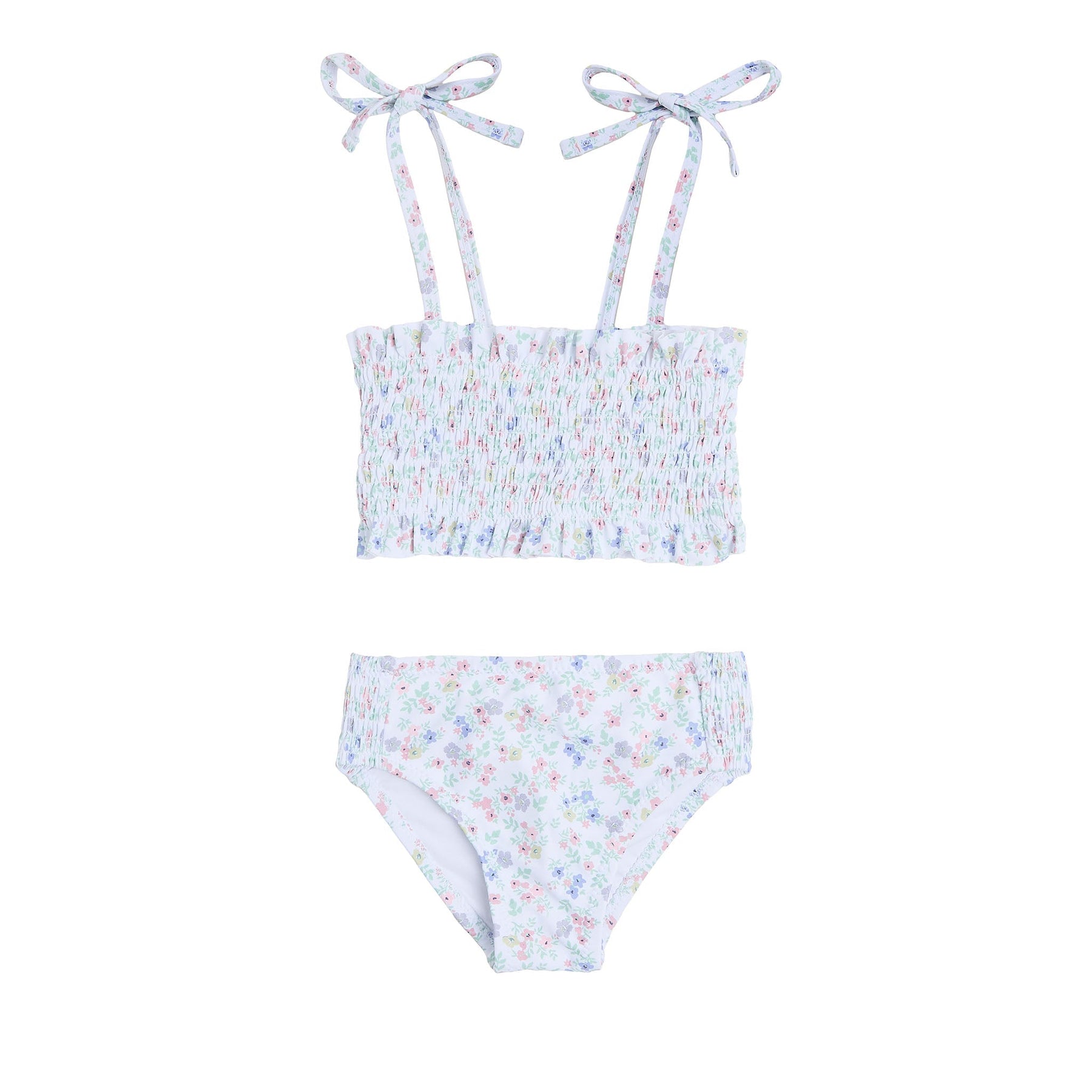 Two piece tankini set in exclusive floral print with smocking top and adjustable spaghetti tie straps. Matching bottoms with smocking at hips. UPF50+ and quick dry capacity. Composition: Recycled 80% polyester, 20% elasten.