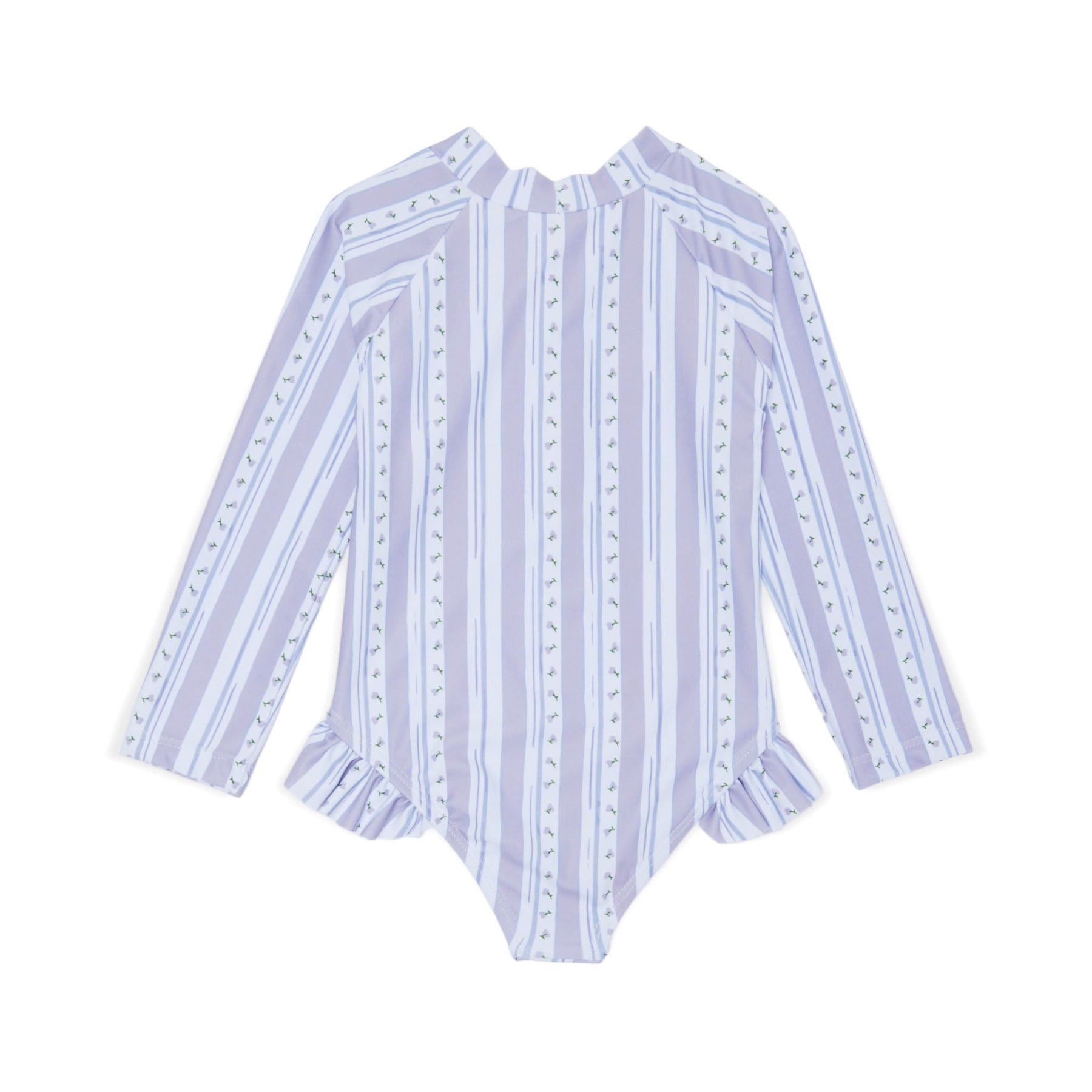 Rashguard swimsuit in an exclusive hand painted stripe print. Zip up front for easy dressing. UPF50+ and quick dry capacity. Composition: Recycled 80% polyester, 20% elasten.