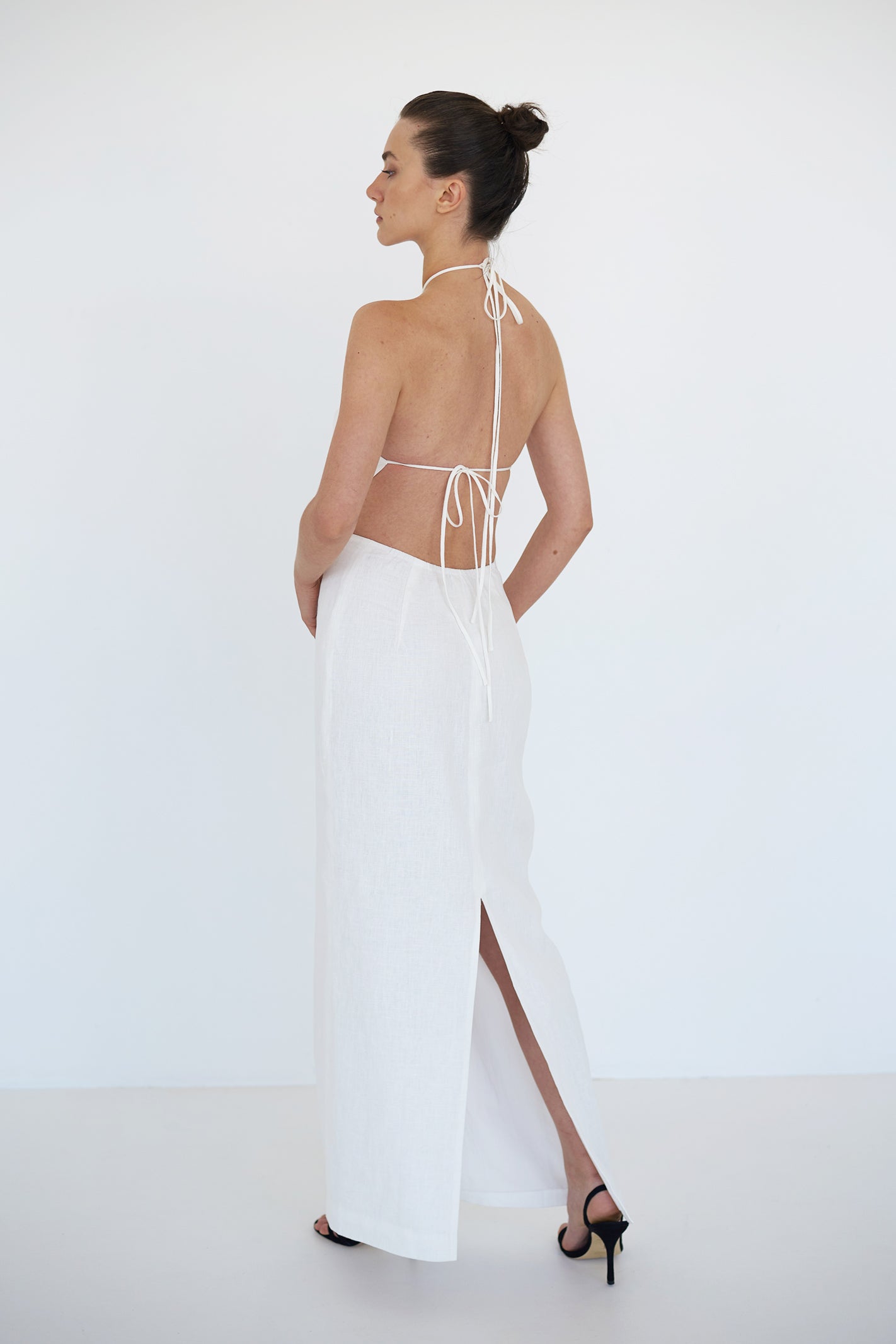 The Anne Openback Linen Dress is cut from mid-weight linen, featuring an open back with self-tie straps, and a straight skirt with a back slit. Waistband is elasticized at the back for a flexible fit.