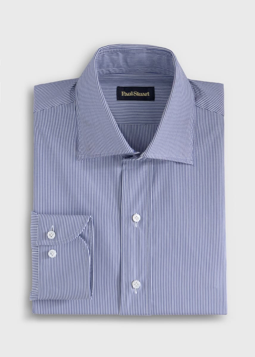 Stripe shirting adds an element of style to your tailored wardrobe. Crafted from Italian cotton, this slim fit Bengal stripe dress shirt adds a pop of color and pattern to your everyday tailoring. Features include Italian fabric, slim fit, Prince of Wales collar, barrel cuff, single needle stitching, mother of pearl buttons, and made in Canada.