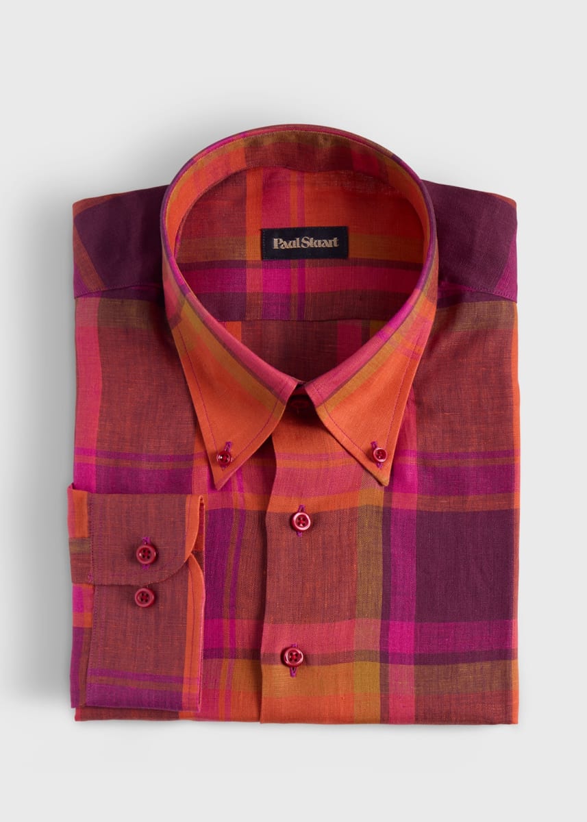 Expertly crafted and designed exclusively for Paul Stuart, this linen plaid sport shirt is an easy everyday style for the season. We love it paired with classic trousers and a jacket. Features include a button down collar, barrel cuffs, plaid pattern, exclusive Paul Stuart design, and made in Canada.
