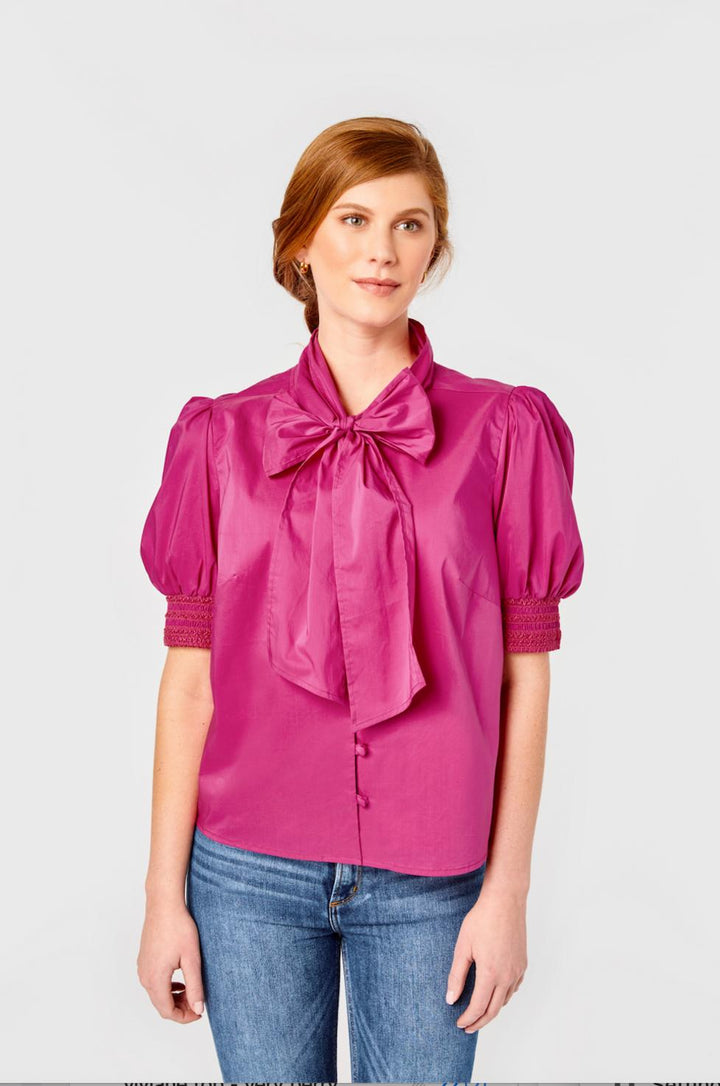 Inspired by our brand's most important muse, our founder's mother, Peggy. The Peggy is a best-selling top pulled straight from faded photos of yesteryear's European travels. This blouse features a smocked cuff band with custom embroidery, side vents, a box pleat on the back, and a sweet bow at the neck. The fabric offers the stretch and recovery of spandex for soft breathability and moisture-wicking smoothness. Designed, smocked, dyed, and sewn in Los Angeles.