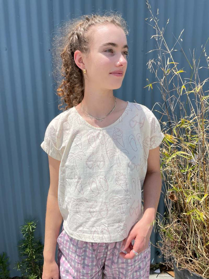 Zelia Top from size XS to XXL. Print available in lavender and brown 100% natural hand-woven cotton. Woven by our artisans in our cooperative in India. Hand-block printed.