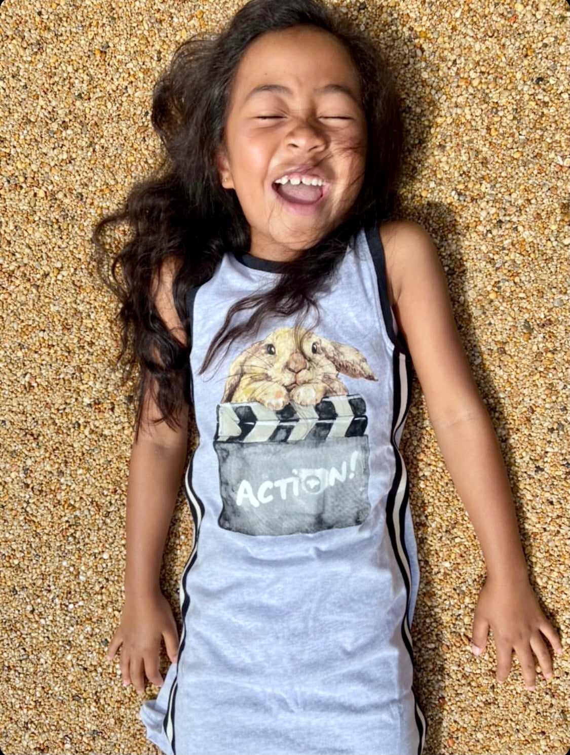 Elevate your little one's wardrobe this Easter and beyond with a stylish bunny dress made from ultra soft GOTS certified 100% organic cotton. Designed for both comfort and style, this dress features decorative tape and long side slits for a trendy sporty touch. The cute hand-painted bunny graphic is screen-printed with eco-friendly water-based inks, adding a playful touch to the overall look. Your little bunny will love wearing this dress on any occasion, whether it's an Easter hunt party, a playdate or a family outing.