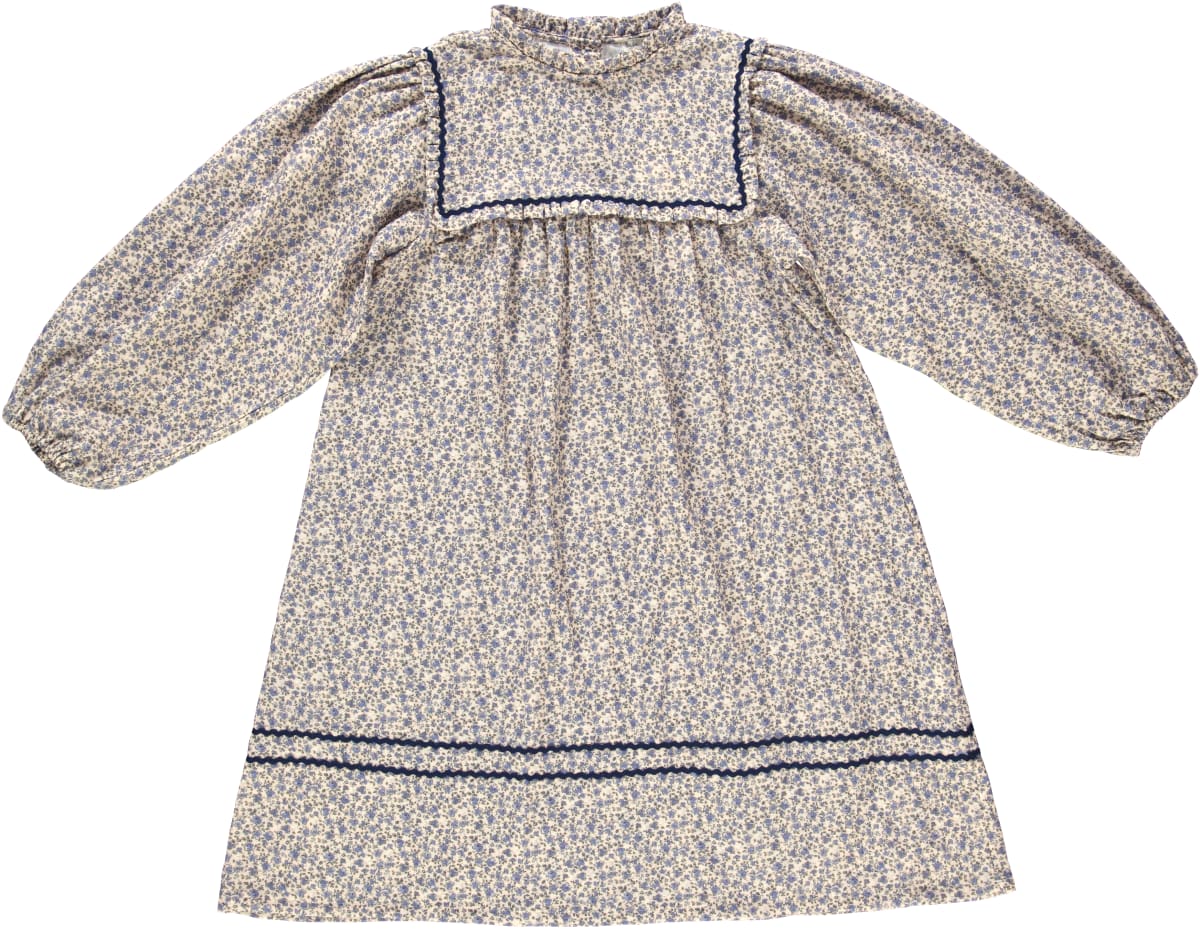 Inspired by vintage childhood memories, our beloved Carlotta dress is crafted from the softest organic cotton in sky blue floral print and trimmed with navy blue velvet tape. Gentle ruffled detailing at the chest and collar with balloon puff sleeves make the dress look both nice and comfortable. Perfect match with Carlotta big bow.