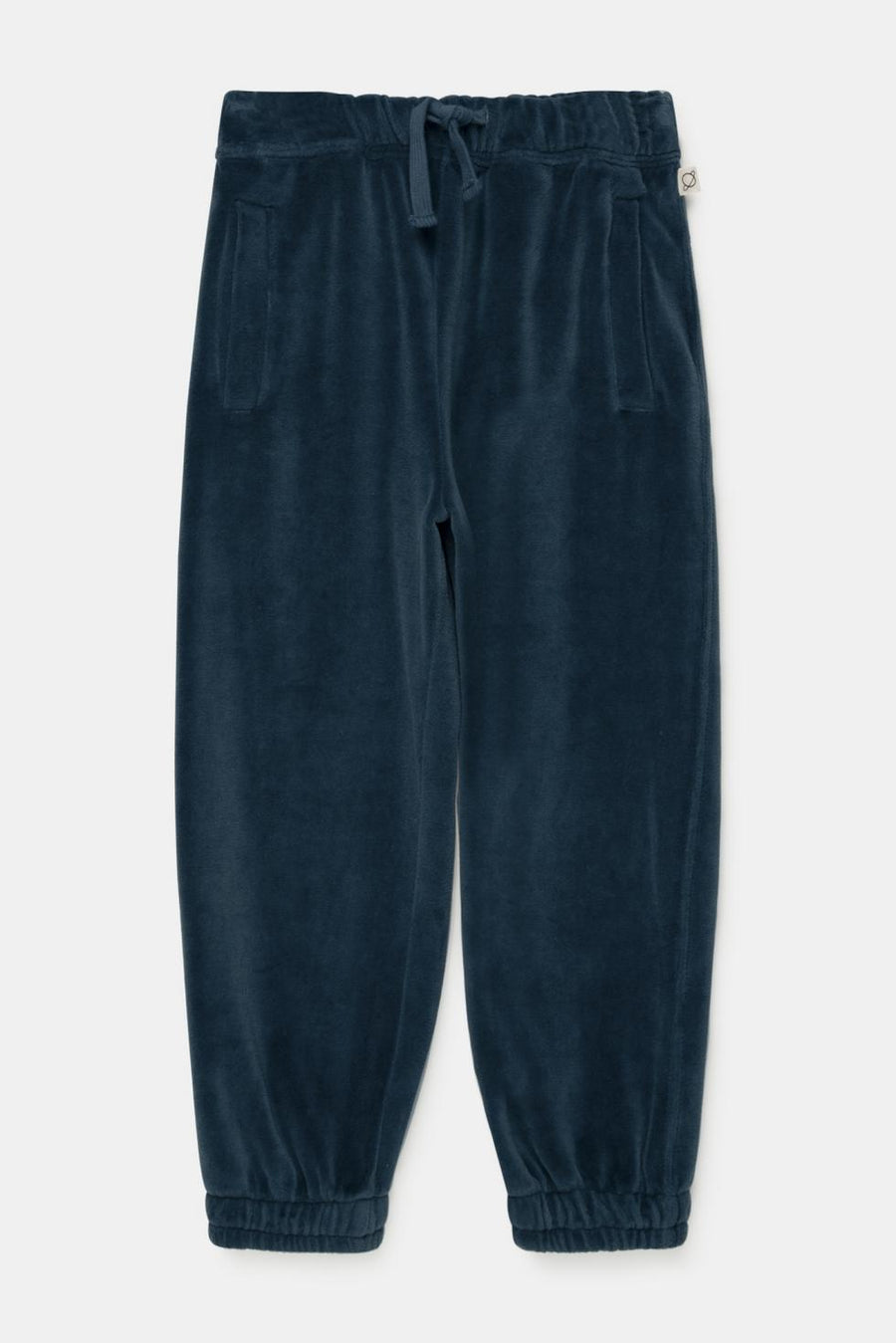 These organic pants have an elastic drawstring waistband, side pockets, ribbed hems, and a patch pocket at the back.