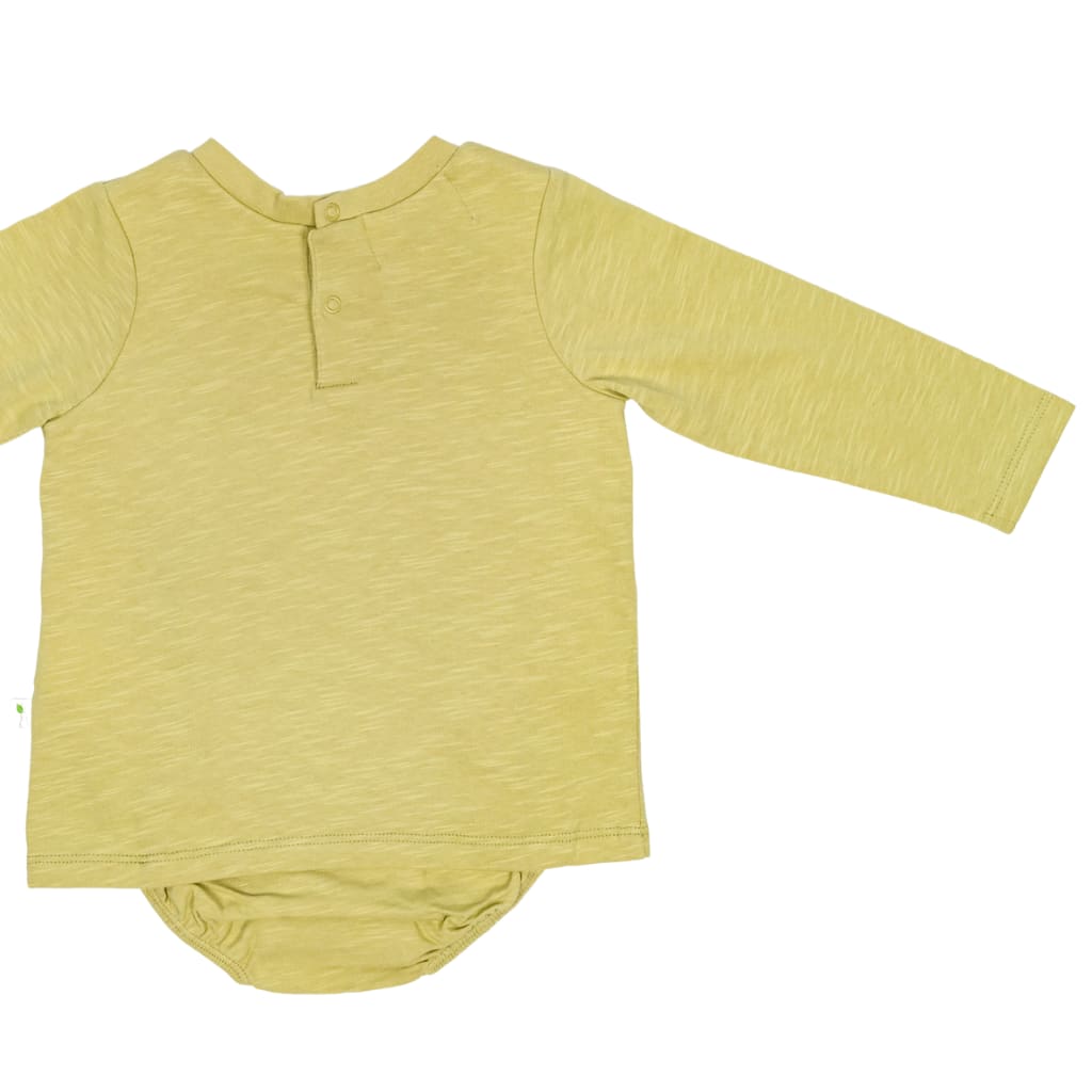 Made with GOTS certified 100% organic cotton, that is breathable and oh-so-soft, our cleverly crafted T-Shirt with long sleeves, covers the upper torso completely, while the hidden lower bodysuit with snap buttons, offers a cozy, snug fit that moves with your baby's every wiggle and giggle.