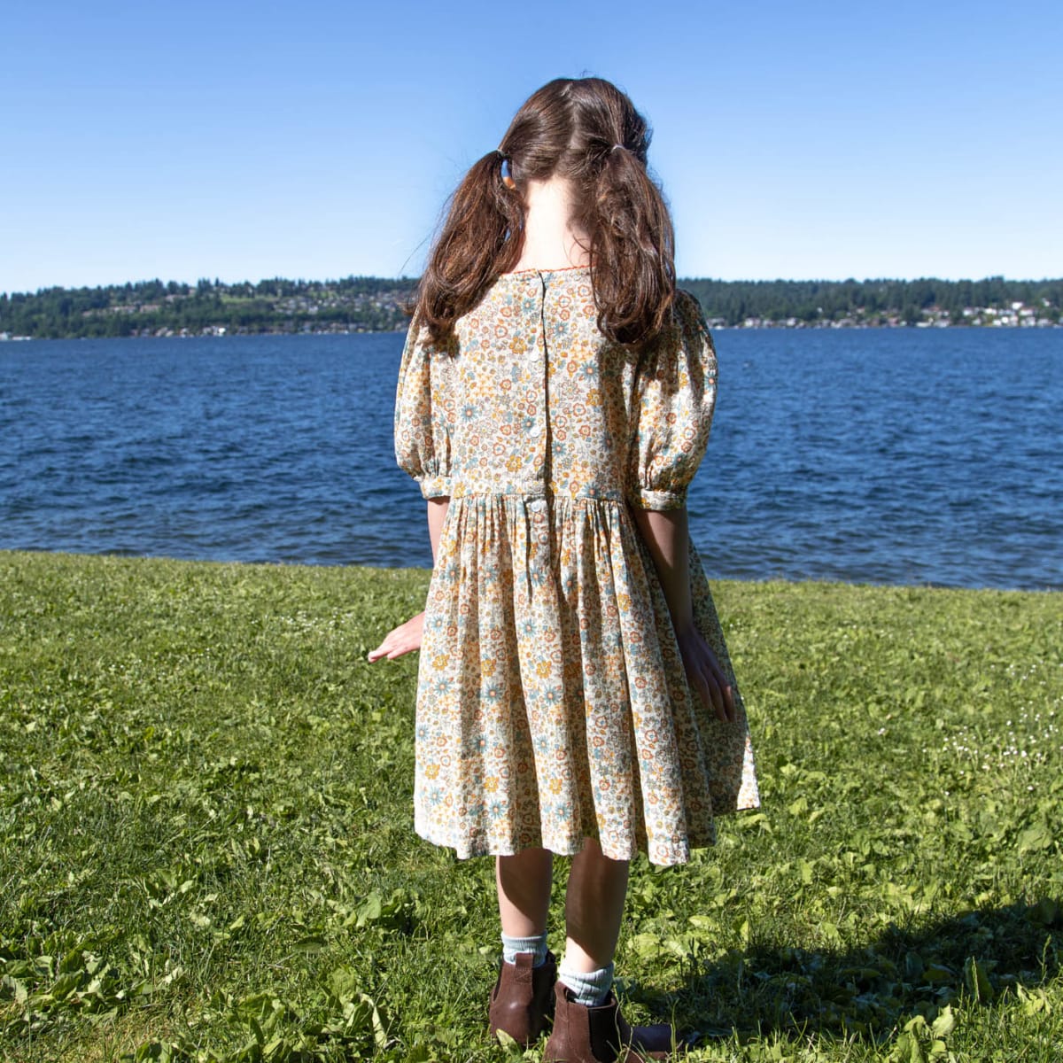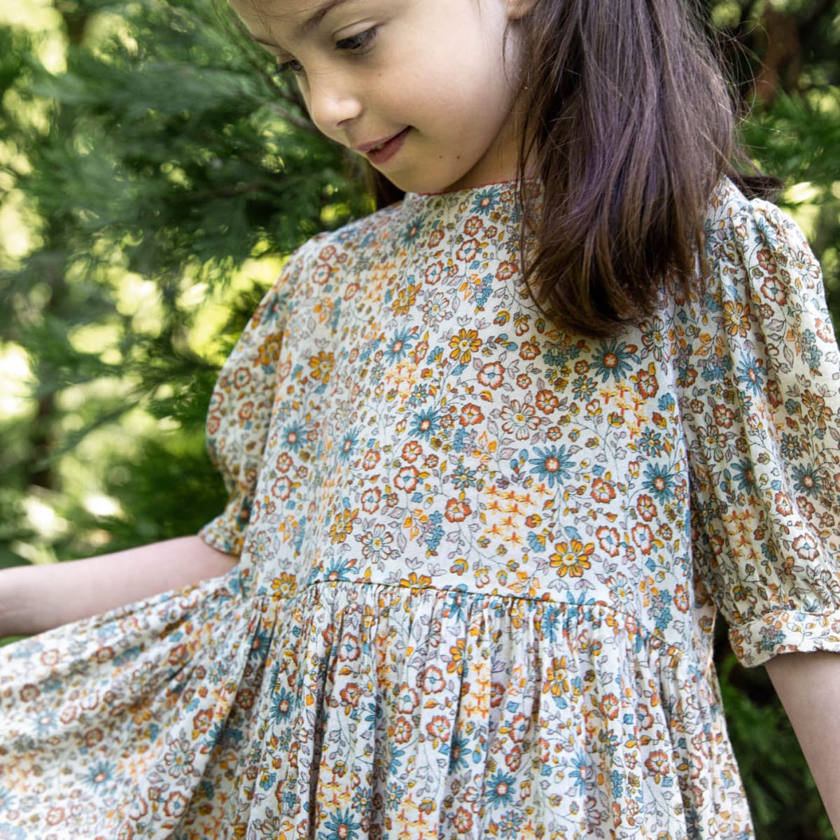 Introducing our timeless and elegant dress, designed to capture the essence of classic style. This dress features a round neck, gorgeous picoting lace in rust orange and a back button panel for effortless dressing. The standout feature is the voluminous sleeves, which lend an air of grace and charm to your little one's look. The dress also boasts a very wide skirt, perfect for twirls and creating a sense of magic and playfulness.