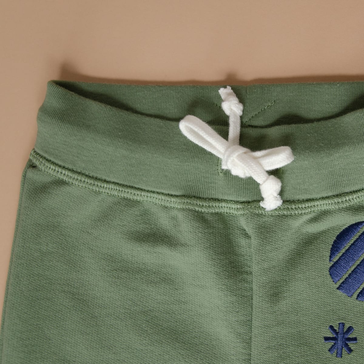 Green sweatpants with embroidery at one hit. Made of 100% organic Pima cotton. Elastic waist with drawstrings.