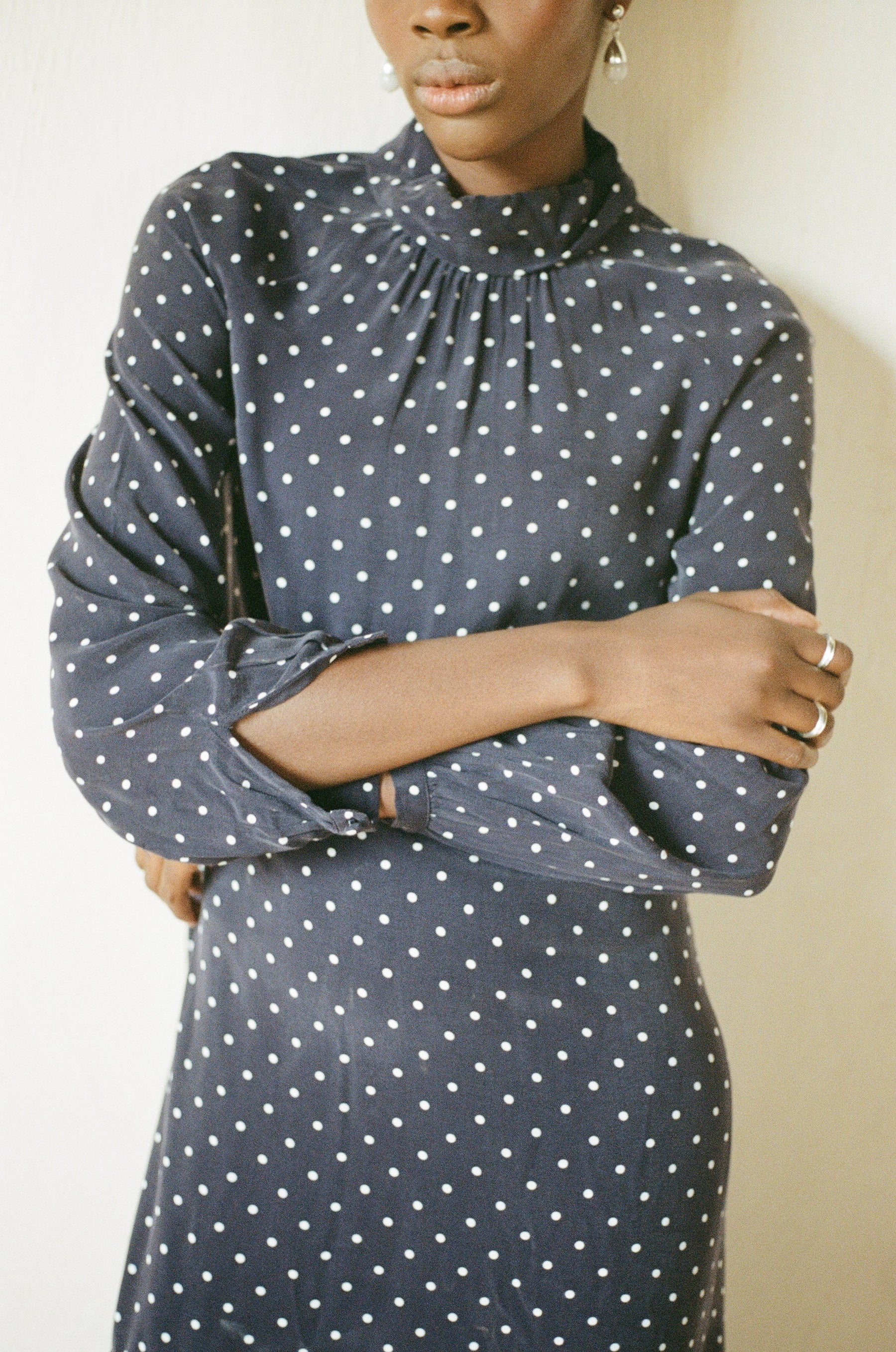 A simple yet bodice for an elegant shape and feel on the body. Folded high neckline. Deep, side seam pockets for a touch of utility. Long sleeves button at cuffs.