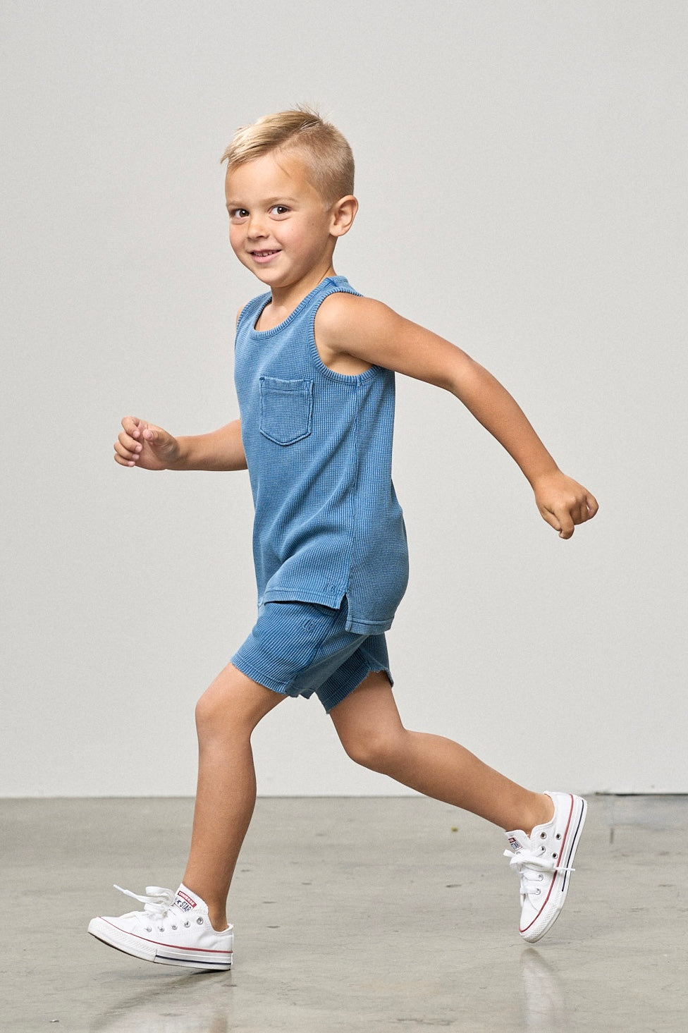 The Waffle Tank is designed for easy comfort and everyday wear. Made with a soft waffle texture, it features a functional front pocket along with subtle details like a high-low hem and side slits for added movement.